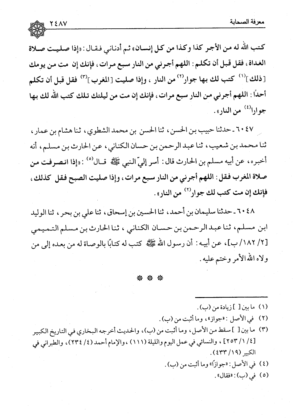 ٦٠٤٧ - حَدَّثَنَا حَبِيبُ بْنُ الْحَسَنِ، ثنا الْحَسَنُ بْنُ مُحَمَّدٍ الشَّطَوِيُّ، ثنا هِشَامُ بْنُ عَمَّارٍ، ثنا مُحَمَّدُ بْنُ شُعَيْبٍ، ثنا عَبْدُ الرَّحْمَنِ بْنُ حَسَّانَ الْكِنَانِيُّ، عَنِ الْحَارِثِ بْنِ مُسْلِمٍ، أَنَّهُ أَخْبَرَهُ، عَنْ أَبِيهِ: مُسْلِمِ بْنِ الْحَارِثِ قَالَ: " أَسَرَّ إِلَيَّ النَّبِيُّ صَلَّى اللَّهُ عَلَيْهِ وَسَلَّمَ قَالَ: " إِذَا انْصَرَفْتَ مِنْ صَلَاةِ الْمَغْرِبِ فَقُلِ: اللهُمَّ أَجِرْنِي مِنَ النَّارِ - سَبْعَ مَرَّاتٍ , وَإِذَا صَلَّيْتَ الصُّبْحَ فَقُلْ كَذَلِكَ، فَإِنَّكَ إِنْ مِتَّ كُتِبَ لَكَ جِوَارٌ مِنَ النَّارِ "
