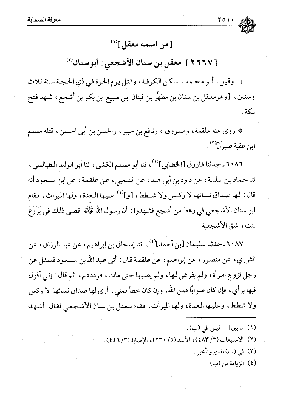 ٦٠٨٦ - حَدَّثَنَا فَارُوقٌ الْخَطَّابِيُّ، ثنا أَبُو مُسْلِمٍ الْكَشِّيُّ، ثنا أَبُو الْوَلِيدِ الطَّيَالِسِيُّ، ثنا حَمَّادُ بْنُ سَلَمَةَ، عَنْ دَاوُدَ بْنِ أَبِي هِنْدٍ، عَنِ الشَّعْبِيِّ، عَنْ عَلْقَمَةَ، عَنِ ابْنِ مَسْعُودٍ، أَنَّهُ قَالَ: «لَهَا صَدَاقُ نِسَائِهَا , لَا وَكْسَ وَلَا شَطَطَ، وَعَلَيْهَا الْعِدَّةُ، وَلَهَا الْمِيرَاثُ» ، فَقَامَ أَبُو سِنَانٍ الْأَشْجَعِيُّ فِي رَهْطٍ مِنْ أَشْجَعَ , فَشَهِدُوا: أَنَّ رَسُولَ اللهِ صَلَّى اللَّهُ عَلَيْهِ وَسَلَّمَ قَضَى ذَلِكَ فِي بِرْوَعَ بِنْتِ وَاشِقٍ الْأَشْجَعِيَّةِ "