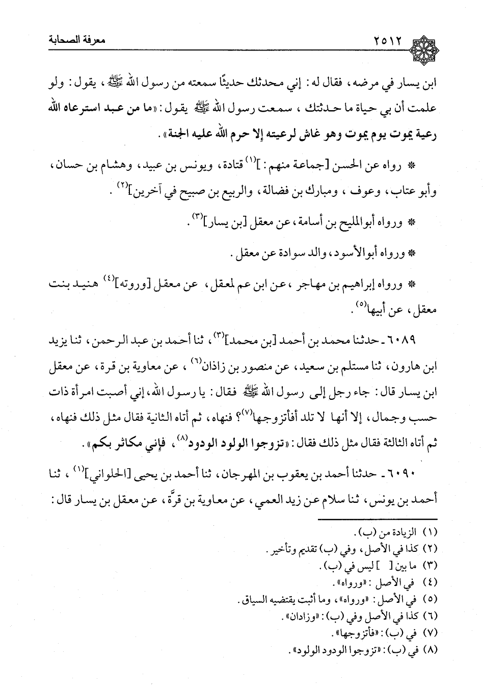٦٠٨٩ - حَدَّثَنَا مُحَمَّدُ بْنُ أَحْمَدَ بْنِ مُحَمَّدٍ، ثنا أَحْمَدُ بْنُ عَبْدِ الرَّحْمَنِ، ثنا يَزِيدُ بْنُ هَارُونَ، ثنا مُسْتَلِمُ بْنُ سَعِيدٍ، عَنْ مَنْصُورِ بْنِ زَاذَانَ، عَنْ مُعَاوِيَةَ بْنِ قُرَّةَ، عَنْ مَعْقِلِ بْنِ يَسَارٍ، قَالَ: " جَاءَ رَجُلٌ إِلَى رَسُولِ اللهِ صَلَّى اللَّهُ عَلَيْهِ وَسَلَّمَ , فَقَالَ: يَا رَسُولَ اللهِ، إِنِّي أَصَبْتُ امْرَأَةً ذَاتَ حَسَبٍ وَجَمَالٍ، إِلَّا أَنَّهَا لَا تَلِدُ , أَفَأَتَزَوَّجُهَا؟ فَنَهَاهُ، ثُمَّ أَتَاهُ الثَّانِيَةَ، فَقَالَ مِثْلَ ذَلِكَ , فَنَهَاهُ، ثُمَّ أَتَاهُ الثَّالِثَةَ فَقَالَ مِثْلَ ذَلِكَ , فَقَالَ: «تَزَوَّجُوا الْوَلُودَ الْوَدُودَ، فَإِنِّي مُكَاثِرٌ بِكُمْ»