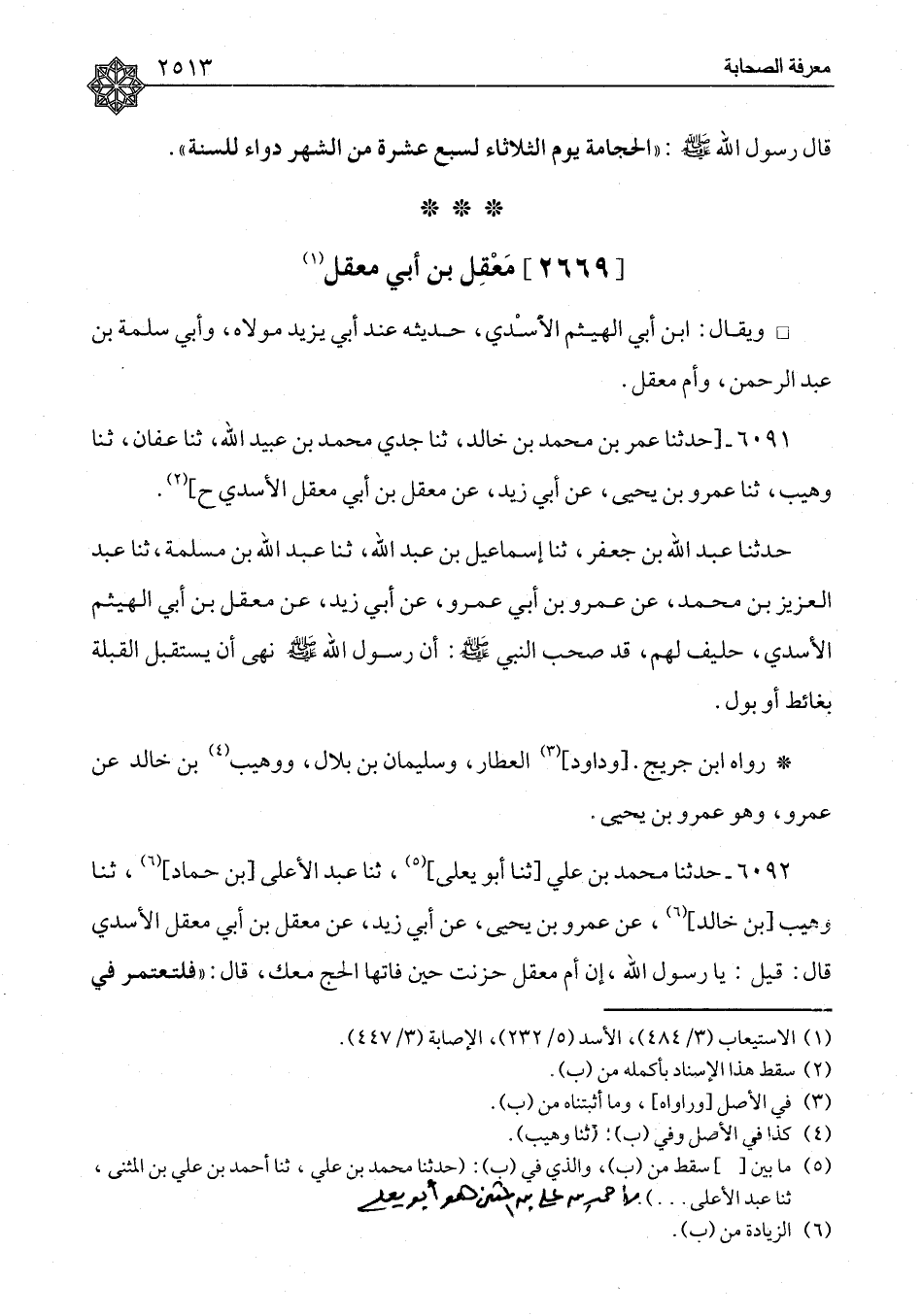 ٦٠٩١ - حَدَّثَنَا عُمَرُ بْنُ مُحَمَّدِ بْنِ خَالِدٍ، ثنا جَدِّي مُحَمَّدُ بْنُ عُبَيْدِ اللهِ، ثنا عَفَّانُ، ثنا وُهَيْبٌ، ثنا عَمْرُو بْنُ يَحْيَى، عَنْ أَبِي زَيْدٍ، عَنْ مَعْقِلٍ بْنِ أَبِي مَعْقِلٍ الْأَسَدِيِّ، ح، حَدَّثَنَا عَبْدُ اللهِ بْنُ جَعْفَرٍ، ثنا إِسْمَاعِيلُ بْنُ عَبْدِ اللهِ، ثنا عَبْدُ اللهِ بْنُ مَسْلَمَةَ، ثنا عَبْدُ الْعَزِيزِ بْنُ مُحَمَّدٍ، عَنْ عَمْرِو بْنِ أَبِي عَمْرٍو، عَنْ أَبِي زَيْدٍ، عَنْ مَعْقِلِ بْنِ أَبِي الْهَيْثَمِ الْأَسَدِيِّ، - حَلِيفٍ لَهُمْ قَدْ صَحِبَ النَّبِيَّ صَلَّى اللَّهُ عَلَيْهِ وَسَلَّمَ - أَنَّ رَسُولَ اللهِ صَلَّى اللَّهُ عَلَيْهِ وَسَلَّمَ «نَهَى أَنْ يَسْتَقْبِلَ الْقِبْلَةَ بِغَائِطٍ أَوْ بَوْلٍ» رَوَاهُ ابْنُ جُرَيْجٍ، وَدَاوُدُ الْعَطَّارُ، وَسُلَيْمَانُ بْنُ بِلَالٍ، وَوُهَيْبُ بْنُ خَالِدٍ , عَنْ عَمْرٍو، وَهُوَ عَمْرُو بْنُ يَحْيَى