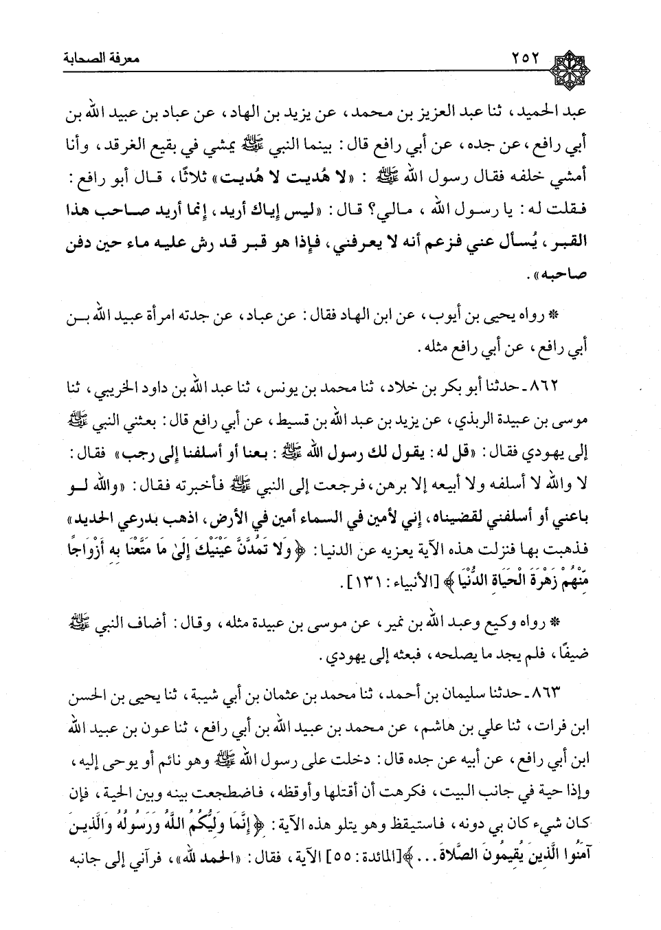 ٨٦٢ - حَدَّثَنَا أَبُو بَكْرِ بْنُ خَلَّادٍ، ثنا مُحَمَّدُ بْنُ يُونُسَ، ثنا عَبْدُ اللهِ بْنُ دَاوُدَ الْخُرَيْبِيُّ، ثنا مُوسَى بْنُ عُبَيْدَةَ الرَّبَذِيُّ، عَنْ يَزِيدَ بْنِ عَبْدِ اللهِ بْنُ قُسَيْطٍ، عَنْ أَبِي رَافِعٍ، قَالَ: بَعَثَنِي النَّبِيُّ صَلَّى اللَّهُ عَلَيْهِ وَسَلَّمَ إِلَى يَهُودِيٍّ فَقَالَ: " قُلْ لَهُ: يَقُولُ لَكَ رَسُولُ اللهِ صَلَّى اللَّهُ عَلَيْهِ وَسَلَّمَ: بِعْنَا أَوْ أَسْلِفْنَا إِلَى رَجَبٍ "، فَقَالَ: لَا وَاللهِ لَا أُسْلِفُهُ، وَلَا أَبِيعُهُ إِلَّا بِرَهْنٍ، فَرَجَعْتُ إِلَى النَّبِيِّ صَلَّى اللَّهُ عَلَيْهِ وَسَلَّمَ فَأَخْبَرْتُهُ فَقَالَ: «وَاللهِ لَوْ بَاعَنِي أَوْ أَسْلَفَنِي لَقَضَيْنَاهُ، إِنِّي لَأَمِينٌ فِي السَّمَاءِ، أَمِينٌ فِي الْأَرْضِ، اذْهَبْ بِدِرْعِي الْحَدِيدِ» ، فَذَهَبْتُ بِهَا، فَنَزَلَتْ هَذِهِ الْآيَةُ يُعَزِّيهِ عَنِ الدُّنْيَا: {وَلَا تَمُدَّنَّ عَيْنَيْكَ إِلَى مَا مَتَّعْنَا بِهِ أَزْوَاجًا مِنْهُمْ زَهْرَةَ الْحَيَاةِ الدُّنْيَا} [طه: ١٣١] " رَوَاهُ وَكِيعٌ، وَعَبْدُ اللهِ بْنُ نُمَيْرٍ، عَنْ مُوسَى بْنِ عُبَيْدَةَ مِثْلَهُ، وَقَالَ: أَضَافَ النَّبِيُّ صَلَّى اللَّهُ عَلَيْهِ وَسَلَّمَ ضَيْفًا فَلَمْ يَجِدْ مَا يُصْلِحُهُ، فَبَعَثَهُ إِلَى يَهُودِيٍّ