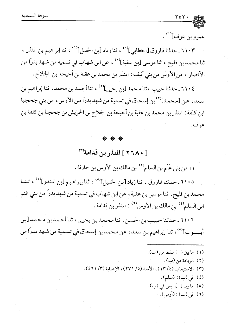 ٦١٠٦ - حَدَّثَنَا حَبِيبُ بْنُ الْحَسَنِ، ثنا مُحَمَّدُ بْنُ يَحْيَى، ثنا أَحْمَدُ بْنُ مُحَمَّدِ بْنِ أَيُّوبَ، ثنا إِبْرَاهِيمُ بْنُ سَعْدٍ، عَنْ مُحَمَّدِ بْنِ إِسْحَاقَ: " فِي تَسْمِيَةِ مَنْ شَهِدَ بَدْرًا مِنَ ⦗٢٥٢١⦘ الْأَوْسِ، مِنْ بَنِي غَنْمِ بْنِ السَّلْمِ بْنِ مَالِكِ بْنِ الْأَوْسِ: الْمُنْذِرُ بْنُ قُدَامَةَ "