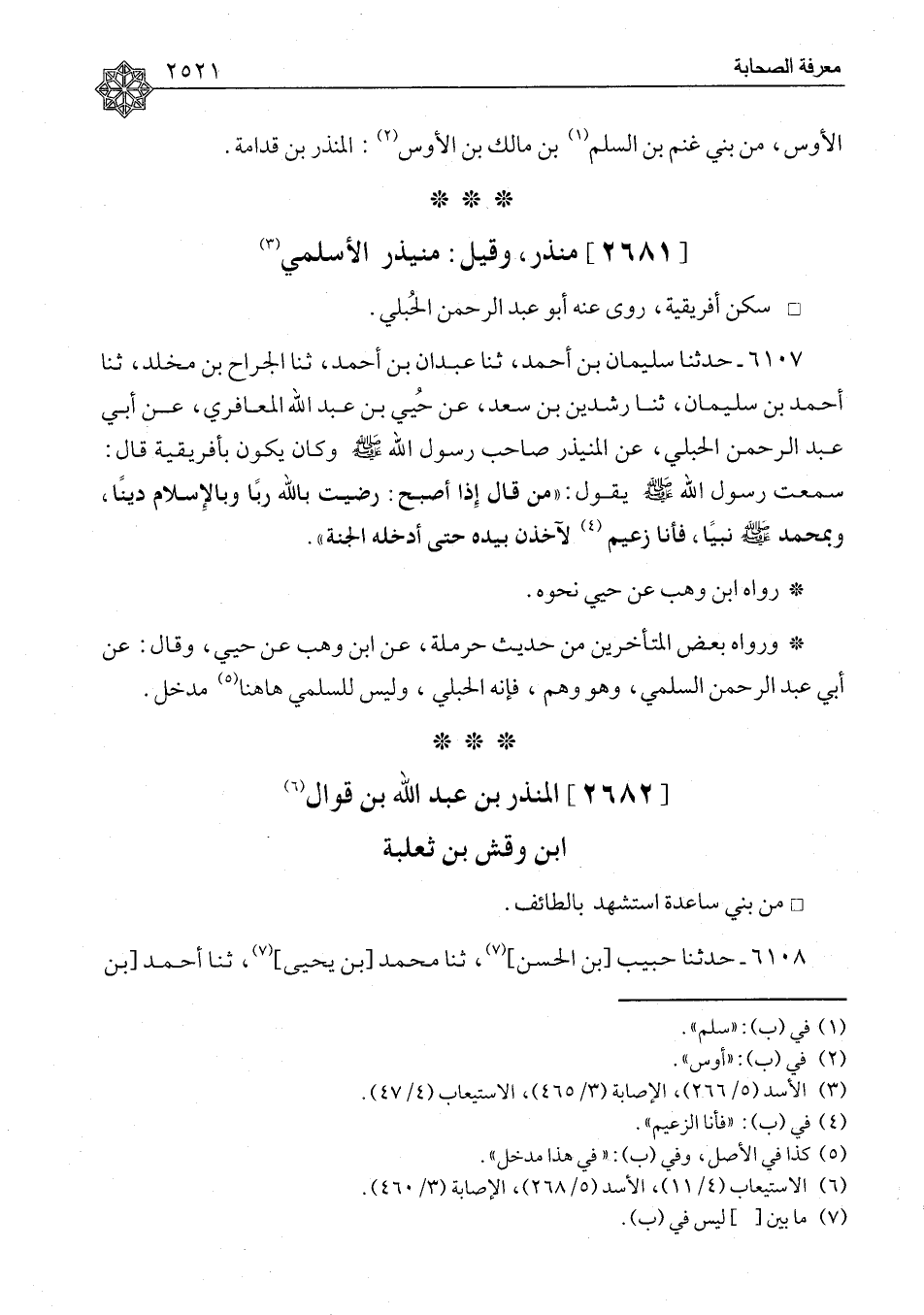 ٦١٠٧ - حَدَّثَنَا سُلَيْمَانُ بْنُ أَحْمَدَ، ثنا عَبْدَانُ بْنُ أَحْمَدَ، ثنا الْجَرَّاحُ بْنُ مَخْلَدٍ، ثنا أَحْمَدُ بْنُ سُلَيْمَانَ، ثنا رِشْدِينُ بْنُ سَعْدٍ، عَنْ حُيَيِّ بْنِ عَبْدِ اللهِ الْمَعَافِرِيِّ، عَنْ أَبِي عَبْدِ الرَّحْمَنِ الْحُبُلِيِّ، عَنِ الْمُنَيْذِرِ، صَاحِبِ رَسُولِ اللهِ صَلَّى اللَّهُ عَلَيْهِ وَسَلَّمَ، وَكَانَ يَكُونُ بِأَفْرِيقِيَّةَ قَالَ: سَمِعْتُ رَسُولَ اللهِ صَلَّى اللَّهُ عَلَيْهِ وَسَلَّمَ يَقُولُ: " مَنْ قَالَ إِذَا أَصْبَحَ: رَضِيتُ بِاللهِ رَبًّا وَبِالْإِسْلَامِ دِينًا، وَبِمُحَمَّدٍ صَلَّى اللَّهُ عَلَيْهِ وَسَلَّمَ نَبِيًّا، فَأَنَا زَعِيمٌ لَآخُذَنَّ بِيَدِهِ حَتَّى أُدْخِلَهُ الْجَنَّةَ " رَوَاهُ ابْنُ وَهْبٍ، عَنْ حُيَيٍّ نَحْوَهُ، وَرَوَاهُ بَعْضُ الْمُتَأَخِّرِينَ مِنْ حَدِيثِ حَرْمَلَةَ، عَنِ ابْنِ وَهْبٍ، عَنْ حُيَيٍّ، وَقَالَ: عَنْ أَبِي عَبْدِ الرَّحْمَنِ السُّلَمِيِّ، وَهُوَ وَهْمٌ، فَإِنَّهُ الْحُبُلِيُّ، وَلَيْسَ لِلسُّلَمِيِّ هَاهُنَا مَدْخَلٌ