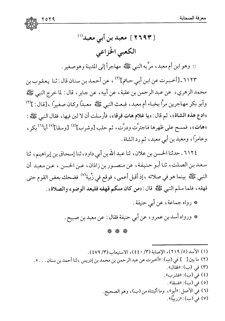 ٦١٢٣ - أُخْبِرْتُ عَنِ ابْنِ أَبِي حَاتِمٍ، عَنْ أَحْمَدَ بْنِ سِنَانٍ، قَالَ: ثنا يَعْقُوبُ بْنُ مُحَمَّدٍ الزُّهْرِيُّ، عَنْ عَبْدِ الرَّحْمَنِ بْنِ عُقْبَةَ، عَنْ أَبِيهِ، عَنْ جَابِرٍ، قَالَ: " لَمَّا خَرَجَ النَّبِيُّ صَلَّى اللَّهُ عَلَيْهِ وَسَلَّمَ , وَأَبُو بَكْرٍ مُهَاجِرِينَ مَرَّا بِخِبَاءِ أُمِّ مَعْبَدٍ , فَبَعَثَ النَّبِيُّ صَلَّى اللَّهُ عَلَيْهِ وَسَلَّمَ مَعْبَدًا , وَكَانَ صَغِيرًا قَالَ: «ادْعُ هَذِهِ الشَّاةَ» ، ثُمَّ قَالَ: «يَا غُلَامِ , هَاتِ فَرْقًا» ، فَأَرْسَلَتْ أَنْ لَا لَبَنَ فِيهَا، فَقَالَ النَّبِيُّ صَلَّى اللَّهُ عَلَيْهِ وَسَلَّمَ: «هَاتِ» ، فَمَسَحَ عَلَى ظَهْرِهَا , فَاجْتَرَّتْ وَدَرَّتْ، ثُمَّ حَلَبَ وَشَرِبَ، وَسَقَا أَبَا بَكْرٍ، وَعَامِرًا، وَمَعْبَدَ بْنَ أَبِي مَعْبَدٍ، ثُمَّ رَدَّ الشَّاةَ "