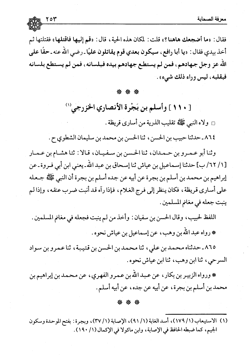 ٨٦٤ - حَدَّثَنَا حَبِيبُ بْنُ الْحَسَنِ، ثنا الْحَسَنُ بْنُ مُحَمَّدِ بْنِ سُلَيْمَانَ الشَّطَوِيُّ ح وَثَنَا أَبُو عَمْرِو بْنُ حَمْدَانَ، ثنا الْحَسَنُ بْنُ سُفْيَانَ، قَالَا: ثنا هِشَامُ بْنُ عَمَّارٍ، حَدَّثَنَا إِسْمَاعِيلُ بْنُ عَيَّاشٍ، ثنا إِسْحَاقُ بْنُ عَبْدِ اللهِ، يَعْنِي ابْنَ أَبِي فَرْوَةَ، عَنْ إِبْرَاهِيمَ بْنِ مُحَمَّدِ بْنِ أَسْلَمَ بْنِ بَجْرَةَ، عَنْ أَبِيهِ، عَنْ جَدِّهِ، أَسْلَمَ بْنِ بَجْرَةَ، «أَنَّ النَّبِيَّ صَلَّى اللَّهُ عَلَيْهِ وَسَلَّمَ جَعَلَهُ عَلَى أُسَارَى قُرَيْظَةَ، فَكَانَ يَنْظُرُ إِلَى فَرْجِ الْغُلَامِ، فَإِذَا رَآهُ قَدْ أَنْبَتَ ضَرَبَ عُنُقَهُ، وَإِذَا لَمْ يُنْبِتْ جَعَلَهُ فِي مَغَانِمِ الْمُسْلِمِينَ» اللَّفْظُ لِحَبِيبٍ، وَقَالَ الْحَسَنُ بْنُ سُفْيَانَ، وَأَخَذَ مَنْ لَمْ يُنْبُتُ فَجَعَلَهُ فِي مَغَانِمِ الْمُسْلِمِينَ، رَوَاهُ عَبْدُ اللهِ بْنُ وَهْبٍ، عَنْ إِسْمَاعِيلَ بْنِ عَيَّاشٍ نَحْوَهُ