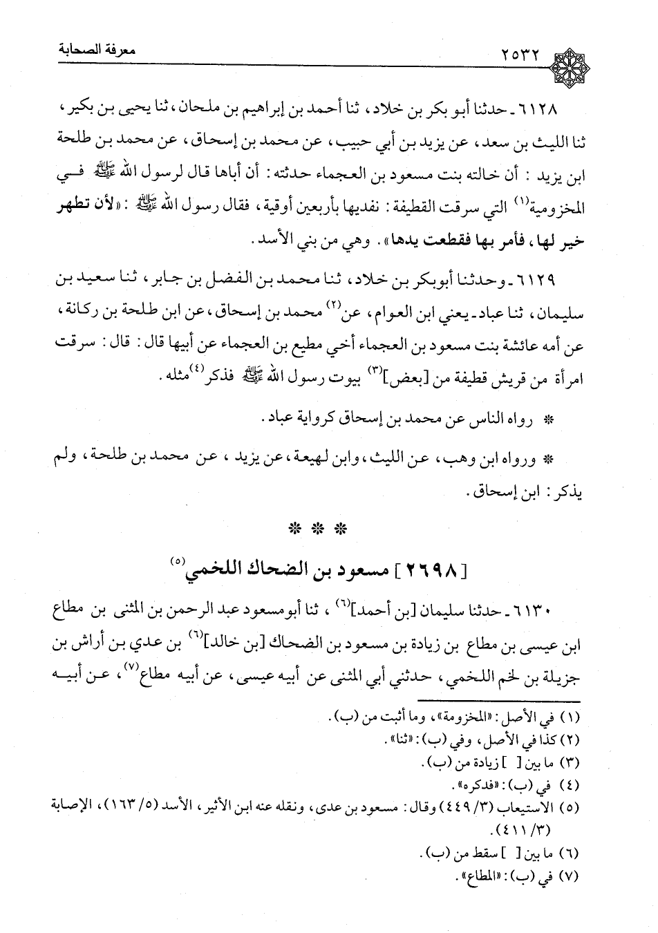 ٦١٢٨ - حَدَّثَنَا أَبُو بَكْرِ بْنُ خَلَّادٍ، ثنا أَحْمَدُ بْنُ إِبْرَاهِيمَ بْنِ مِلْحَانَ، ثنا يَحْيَى بْنُ بُكَيْرٍ، ثنا اللَّيْثُ بْنُ سَعْدٍ، عَنْ يَزِيدَ بْنِ أَبِي حَبِيبٍ، عَنْ مُحَمَّدِ بْنِ إِسْحَاقَ، عَنْ مُحَمَّدِ بْنِ طَلْحَةَ بْنِ يَزِيدَ، أَنَّ خَالَتَهُ بِنْتَ مَسْعُودِ ابْنِ الْعَجْمَاءِ، حَدَّثَتْهُ، أَنَّ أَبَاهَا قَالَ لِرَسُولِ اللهِ صَلَّى اللَّهُ عَلَيْهِ وَسَلَّمَ: " فِي الْمَخْزُومِيَّةِ الَّتِي سَرَقَتِ الْقَطِيفَةَ: نَفْدِيهَا بِأَرْبَعِينَ أُوقِيَّةً، فَقَالَ رَسُولُ اللهِ صَلَّى اللَّهُ عَلَيْهِ وَسَلَّمَ: «لَأَنْ تُطَهَّرَ خَيْرٌ لَهَا» ، فَأَمَرَ بِهَا , فَقُطِعَتْ يَدُهَا , وَهِيَ مِنْ بَنِي الْأَسَدِ "