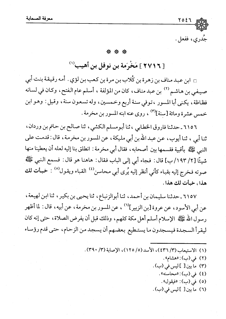 مَخْرَمَةُ بْنُ نَوْفَلِ بْنِ أُهَيْبِ بْنِ عَبْدِ مَنَافِ بْنِ زُهْرَةَ بْنِ كِلَابِ بْنِ مُرَّةَ بْنِ كَعْبِ بْنِ لُؤَيٍّ أُمُّهُ رُقَيْقَةُ بِنْتُ أَبِي صَيْفِيِّ بْنِ هَاشِمِ بْنِ عَبْدِ مَنَافٍ، كَانَ مِنَ الْمُؤَلَّفَةِ، أَسْلَمَ عَامَ الْفَتْحِ، وَكَانَ فِي لِسَانِهِ فَظَاظَةٌ، يُكْنَى أَبَا الْمِسْوَرِ، تُوُفِّيَ سَنَةَ أَرْبَعٍ وَخَمْسِينَ، وَلَهُ تَسْعَوْنَ سَنَةً، وَقِيلَ: وَهُوَ ابْنُ خَمْسَ عَشْرَةَ وَمِائَةِ سَنَةٍ، رَوَى عَنْهُ ابْنُهُ الْمِسْوَرُ بْنُ مَخْرَمَةَ
