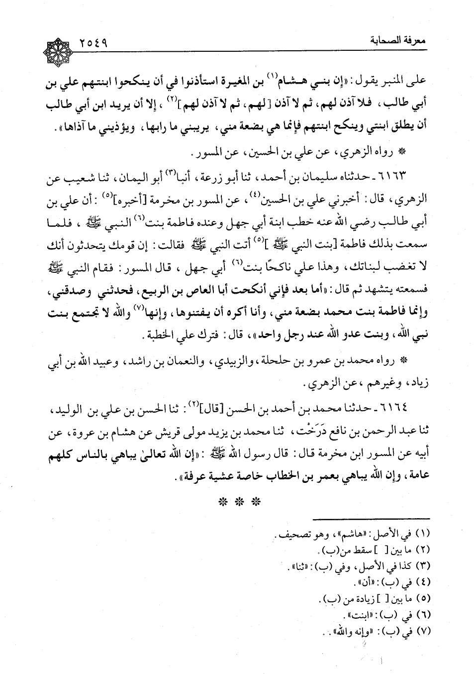 ٦١٦٣ - حَدَّثَنَاهُ سُلَيْمَانُ بْنُ أَحْمَدَ، ثنا أَبُو زُرْعَةَ، أنبا أَبُو الْيَمَانِ، ثنا شُعَيْبٌ، عَنِ الزُّهْرِيِّ، قَالَ: أَخْبَرَنِي عَلِيُّ بْنُ الْحُسَيْنِ، عَنِ الْمِسْوَرِ بْنِ مَخْرَمَةَ أَخْبَرَهُ: أَنَّ عَلِيَّ بْنَ أَبِي طَالِبٍ رَضِيَ اللهُ عَنْهُ: " خَطَبَ ابْنَةَ أَبِي جَهْلٍ وَعِنْدَهُ فَاطِمَةُ بِنْتُ النَّبِيِّ صَلَّى اللَّهُ عَلَيْهِ وَسَلَّمَ، فَلَمَّا سَمِعَتْ بِذَلِكَ فَاطِمَةُ بِنْتُ النَّبِيِّ صَلَّى اللَّهُ عَلَيْهِ وَسَلَّمَ، أَتَتِ النَّبِيَّ صَلَّى اللَّهُ عَلَيْهِ وَسَلَّمَ فَقَالَتْ: إِنَّ قَوْمَكَ يَتَحَدَّثُونَ أَنَّكَ لَا تَغْضَبُ لِبَنَاتِكَ، وَهَذَا عَلِيٌّ نَاكِحًا بِنْتَ أَبِي جَهْلٍ , قَالَ الْمِسْوَرُ: فَقَامَ النَّبِيُّ صَلَّى اللَّهُ عَلَيْهِ وَسَلَّمَ , فَسَمِعْتُهُ يَتَشَهَّدُ ثُمَّ قَالَ: «أَمَّا بَعْدُ , فَإِنِّي أَنْكَحْتُ أَبَا الْعَاصِ بْنَ الرَّبِيعِ، فَحَدَّثَنِي وَصَدَقَنِي، وَإِنَّمَا فَاطِمَةُ بِنْتُ مُحَمَّدٍ بَضْعَةٌ مِنِّي، وَأَنَا أَكْرَهُ أَنْ يَفْتِنُوهَا، وَإِنَّهَا وَاللهِ لَا تَجْتَمِعُ بِنْتُ نَبِيِّ اللهِ، وَبِنْتُ عَدُوِّ اللهِ عِنْدَ رَجُلٍ وَاحِدٍ» قَالَ: فَتَرَكَ عَلِيٌّ الْخِطْبَةَ "، رَوَاهُ مُحَمَّدُ بْنُ عَمْرِو بْنِ حَلْحَلَةَ، وَالزُّبَيْدِيُّ، وَالنُّعْمَانُ بْنُ رَاشِدٍ، وَعُبَيْدُ اللهِ بْنُ أَبِي زِيَادٍ، وَغَيْرُهُمْ، عَنِ الزُّهْرِيِّ