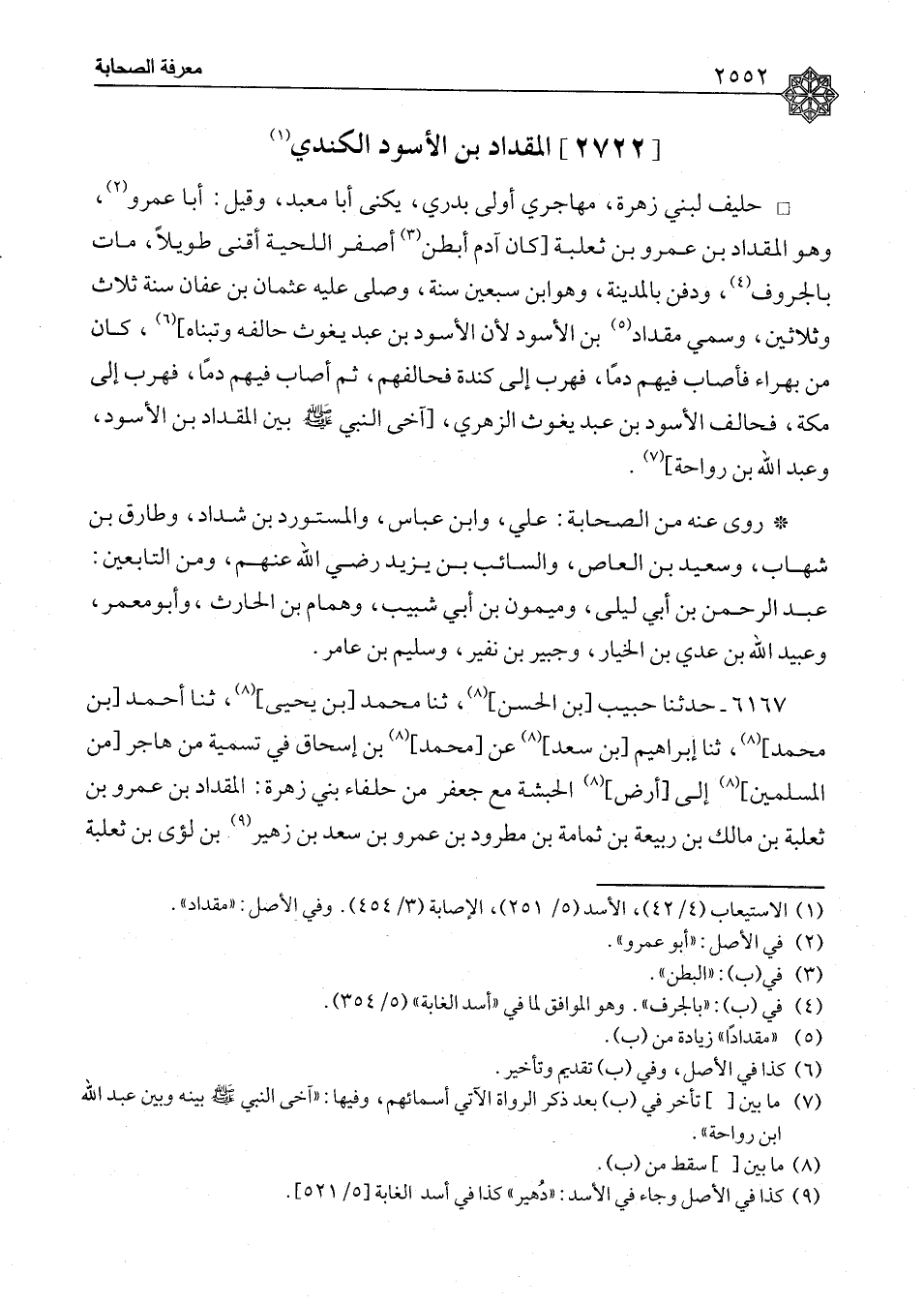 الْمِقْدَادُ بْنُ الْأَسْوَدِ الْكِنْدِيُّ حَلِيفٌ لِبَنِي زُهْرَةَ، مُهَاجِرِيٌّ أَوَّلِيٌّ بَدْرِيٌّ، يُكْنَى أَبَا مَعْبَدٍ، وَقِيلَ: أَبَا عَمْرٍو، وَهُوَ الْمِقْدَادُ بْنُ عَمْرِو بْنِ ثَعْلَبَةَ كَانَ آدَمَ , أَبْطَنَ , أَصْفَرَ اللِّحْيَةِ , أَقْنَى , طَوِيلًا، مَاتَ بِالْجَرُوفِ، وَدُفِنَ بِالْمَدِينَةِ، وَهُوَ ابْنُ سَبْعِينَ سَنَةً، وَصَلَّى عَلَيْهِ عُثْمَانُ بْنُ عَفَّانَ سَنَةَ ثَلَاثٍ وَثَلَاثِينَ، وَسُمِّيَ مِقْدَادَ بْنَ الْأَسْوَدِ لِأَنَّ الْأَسْوَدَ بْنَ عَبْدِ يَغُوثَ حَالَفَهُ وَتَبَنَّاهُ، كَانَ مِنْ بَهْرَاءَ فَأَصَابَ فِيهِمْ دَمًا، فَهَرَبَ إِلَى كِنْدَةَ , فَحَالَفَهُمْ، ثُمَّ أَصَابَ فِيهِمْ دَمًا، فَهَرَبَ إِلَى مَكَّةَ، فَحَالَفَ الْأَسْوَدَ بْنَ عَبْدِ يَغُوثَ الزُّهْرِيَّ آخَى النَّبِيُّ صَلَّى اللَّهُ عَلَيْهِ وَسَلَّمَ بَيْنَ الْمِقْدَادِ بْنِ الْأَسْوَدِ، وَعَبْدِ اللهِ بْنِ رَوَاحَةَ، رَوَى عَنْهُ مِنَ الصَّحَابَةِ: عَلِيٌّ، وَابْنُ عَبَّاسٍ، وَالْمُسْتَوْرِدُ بْنُ شَدَّادٍ، وَطَارِقُ بْنُ شِهَابٍ، وَسَعِيدُ بْنُ الْعَاصِ، وَالسَّائِبُ بْنُ يَزِيدَ رَضِيَ اللهُ عَنْهُمْ، وَمِنَ التَّابِعِينَ: عَبْدُ الرَّحْمَنِ بْنُ أَبِي لِيَلِيَ، وَمَيْمُونُ بْنُ أَبِي شَبِيبٍ، وَهَمَّامُ بْنُ الْحَارِثِ، وَأَبُو مَعْمَرٍ، وَعُبَيْدُ اللهِ بْنُ عَدِيِّ بْنِ الْخِيَارِ، وَجُبَيْرُ بْنُ نُفَيْرٍ، وَسُلَيْمُ بْنُ عَامِرٍ