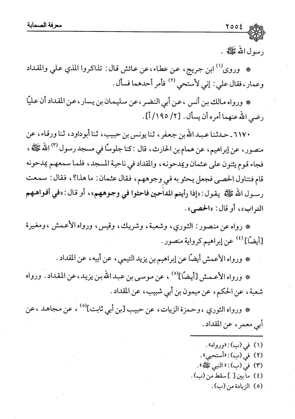 ٦١٧٠ - حَدَّثَنَا عَبْدُ اللهِ بْنُ جَعْفَرٍ، ثنا يُونُسُ بْنُ حَبِيبٍ، ثنا أَبُو دَاوُدَ، ثنا وَرْقَاءُ، عَنْ مَنْصُورٍ، عَنْ إِبْرَاهِيمَ، عَنْ هَمَّامِ بْنِ الْحَارِثِ، قَالَ: " كُنَّا جُلُوسًا فِي مَسْجِدِ رَسُولِ اللهِ صَلَّى اللَّهُ عَلَيْهِ وَسَلَّمَ، فَجَاءَ قَوْمٌ يُثْنُونَ عَلَى عُثْمَانَ وَيَمْدَحُونَهُ، وَالْمِقْدَادُ فِي نَاحِيَةِ الْمَسْجِدِ، فَلَمَّا سَمِعَهُمْ يَمْدَحُونَهُ قَامَ فَتَنَاوَلَ الْحَصَى , فَجَعَلَ يَحْثُو بِهِ فِي وُجُوهِهِمْ، فَقَالَ عُثْمَانُ: مَا هَذَا؟ فَقَالَ: سَمِعْتُ رَسُولَ اللهِ صَلَّى اللَّهُ عَلَيْهِ وَسَلَّمَ يَقُولُ: «إِذَا رَأَيْتُمُ الْمَدَّاحِينَ فَاحْثُوا فِي وُجُوهِهِمْ» ، أَوْ قَالَ: «فِي أَفْوَاهِهِمُ التُّرَابَ» ، أَوْ قَالَ: «الْحَصَى» رَوَاهُ عَنْ مَنْصُورٍ: الثَّوْرِيُّ، وَشُعْبَةُ، وَشَرِيكٌ، وَقَيْسٌ، وَرَوَاهُ الْأَعْمَشُ، وَمُغِيرَةُ أَيْضًا، عَنْ إِبْرَاهِيمَ كَرِوَايَةِ مَنْصُورٍ، وَرَوَاهُ الْأَعْمَشُ أَيْضًا، عَنْ إِبْرَاهِيمَ بْنِ يَزِيدَ التَّيْمِيِّ، عَنْ أَبِيهِ، عَنِ الْمِقْدَادِ وَرَوَاهُ الْأَعْمَشُ أَيْضًا، عَنْ مُوسَى بْنِ عَبْدِ اللهِ بْنِ يَزِيدَ، عَنِ الْمِقْدَادِ وَرَوَاهُ شُعْبَةُ، عَنِ الْحَكَمِ، عَنْ مَيْمُونِ بْنِ أَبِي شَبِيبٍ، عَنِ الْمِقْدَادِ وَرَوَاهُ الثَّوْرِيُّ، وَحَمْزَةُ الزَّيَّاتُ، عَنْ حَبِيبِ بْنِ أَبِي ثَابِتٍ، عَنْ مُجَاهِدٍ، عَنْ أَبِي مَعْمَرٍ، عَنِ الْمِقْدَادِ ⦗٢٥٥٥⦘ وَرَوَاهُ وَائِلُ بْنُ دَاوُدَ، عَنْ عَبْدِ اللهِ الْبَهِيِّ، عَنِ الْمِقْدَادِ