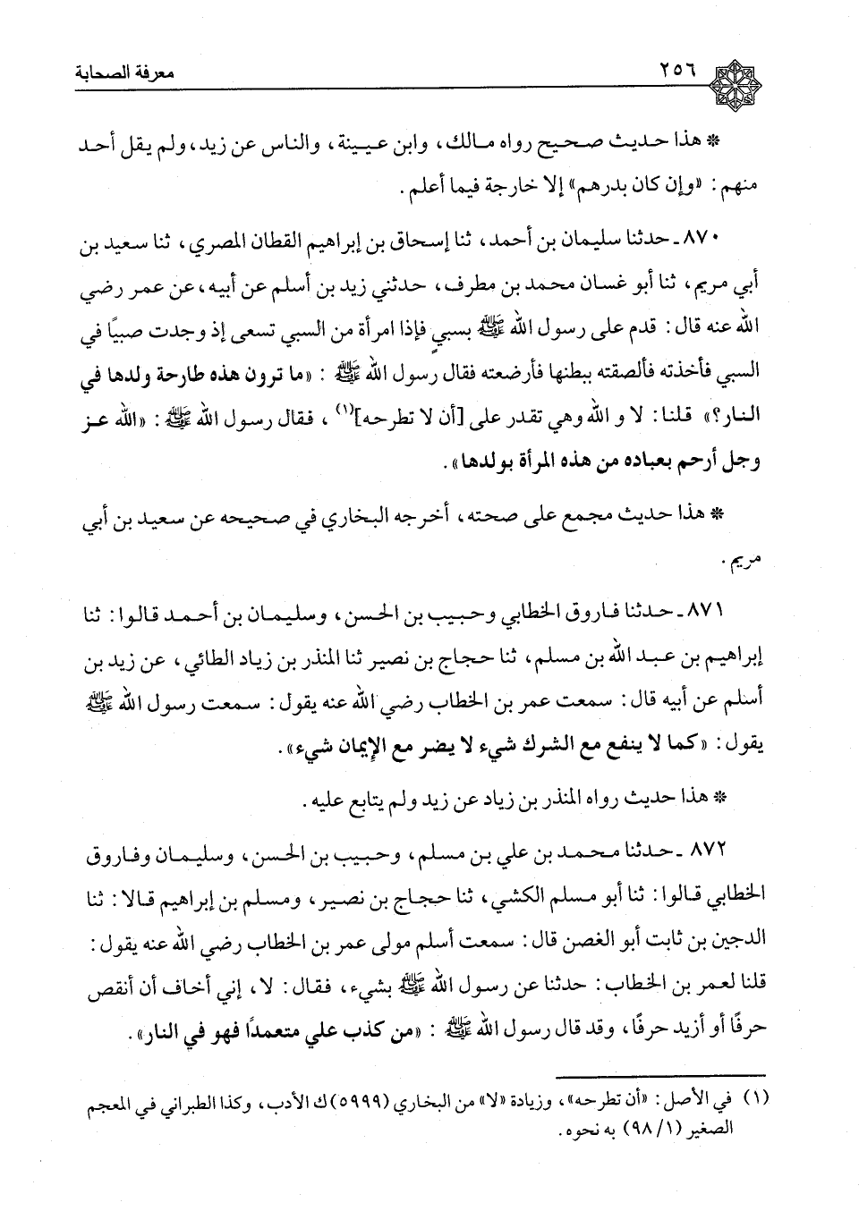 ٨٧٠ - حَدَّثَنَا سُلَيْمَانُ بْنُ أَحْمَدَ، ثنا إِسْحَاقُ بْنُ إِبْرَاهِيمَ الْقَطَّانُ الْمِصْرِيُّ، ثنا سَعِيدُ بْنُ أَبِي مَرْيَمَ، ثنا أَبُو غَسَّانَ مُحَمَّدُ بْنُ مُطَرِّفٍ، حَدَّثَنِي زَيْدُ بْنُ أَسْلَمَ، عَنْ أَبِيهِ، عَنْ عُمَرَ، رَضِيَ اللهُ عَنْهُ قَالَ: قُدِمَ عَلَى رَسُولِ اللهِ صَلَّى اللَّهُ عَلَيْهِ وَسَلَّمَ بِسَبْيٍ، فَإِذَا امْرَأَةٌ مِنَ السَّبْيِ تَسْعَى، إِذْ وَجَدَتْ صَبِيًّا فِي السَّبْيِ، فَأَخَذَتْهُ فَأَلْصَقَتْهُ بِبَطْنِهَا فَأَرْضَعَتْهُ، فَقَالَ رَسُولُ اللهِ صَلَّى اللَّهُ عَلَيْهِ وَسَلَّمَ: «مَا تَرَوْنَ هَذِهِ طَارِحَةً وَلَدَهَا فِي النَّارِ؟» ، قُلْنَا: لَا وَاللهِ وَهِيَ تَقْدِرُ عَلَى أَنْ لا تَطْرَحَهُ، فَقَالَ رَسُولُ اللهِ صَلَّى اللَّهُ عَلَيْهِ وَسَلَّمَ: «اللهُ عَزَّ وَجَلَّ أَرْحَمُ بِعِبَادِهِ مِنْ هَذِهِ الْمَرْأَةِ بِوَلَدِهَا» هَذَا حَدِيثٌ مُجْمَعٌ عَلَى صِحَّتِهِ، أَخْرَجَهُ الْبُخَارِيُّ فِي صَحِيحِهِ، عَنْ سَعِيدِ بْنِ أَبِي مَرْيَمَ