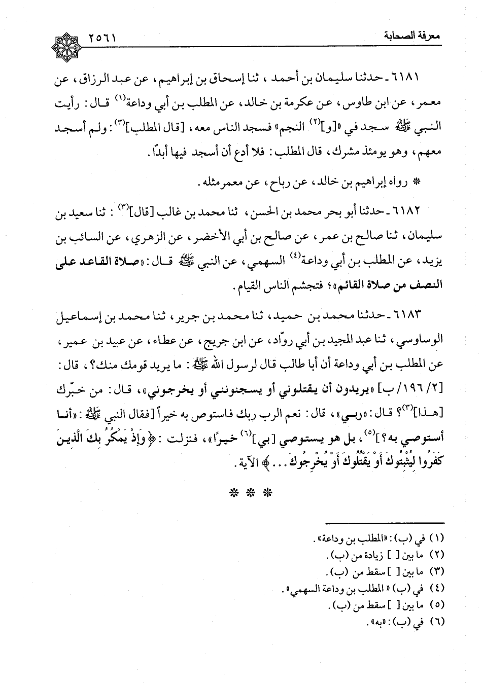 ٦١٨١ - حَدَّثَنَا سُلَيْمَانُ بْنُ أَحْمَدَ، ثنا إِسْحَاقُ بْنُ إِبْرَاهِيمَ، عَنْ عَبْدِ الرَّزَّاقِ، عَنْ مَعْمَرٍ، عَنِ ابْنِ طَاوُسٍ، عَنْ عِكْرِمَةَ بْنِ خَالِدٍ، عَنِ الْمُطَّلِبِ بْنِ أَبِي وَدَاعَةَ، قَالَ: «رَأَيْتُ النَّبِيَّ صَلَّى اللَّهُ عَلَيْهِ وَسَلَّمَ سَجَدَ فِي وَالنَّجْمِ فَسَجَدَ النَّاسُ مَعَهُ» , قَالَ الْمُطَّلِبُ: وَلَمْ أَسْجُدْ مَعَهُمْ، وَهُوَ يَوْمَئِذٍ مُشْرِكٌ , قَالَ الْمُطَّلِبُ: فَلَا أَدَعُ أَنْ أَسْجُدَ فِيهَا أَبَدًا " رَوَاهُ إِبْرَاهِيمُ بْنُ خَالِدٍ، عَنْ رَبَاحٍ، عَنْ مَعْمَرٍ , مِثْلَهُ