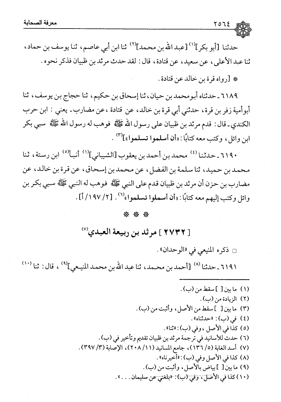 ٦١٨٩ - حَدَّثَنَاهُ أَبُو مُحَمَّدِ بْنُ حَيَّانَ، ثنا إِسْحَاقُ بْنُ حَكِيمٍ، ثنا حَجَّاجُ بْنُ يُوسُفَ، ثنا أَبُو أُمَيَّةَ زُفَرُ بْنُ قُرَّةَ، حَدَّثَنِي أَبِي قُرَّةُ بْنُ خَالِدٍ، عَنْ قَتَادَةَ، عَنْ مُضَارِبٍ يَعْنِي ابْنَ حَرْبٍ الْكِنْدِيَّ - قَالَ: قَدِمَ مَرْثَدُ بْنُ ظَبْيَانَ عَلَى رَسُولِ اللهِ صَلَّى اللَّهُ عَلَيْهِ وَسَلَّمَ , فَوَهَبَ لَهُ رَسُولُ اللهِ صَلَّى اللَّهُ عَلَيْهِ وَسَلَّمَ سَبْيَ بَكْرِ بْنِ وَائِلٍ، وَكَتَبَ مَعَهُ كِتَابًا: «أَنْ أَسْلِمُوا تَسْلَمُوا»