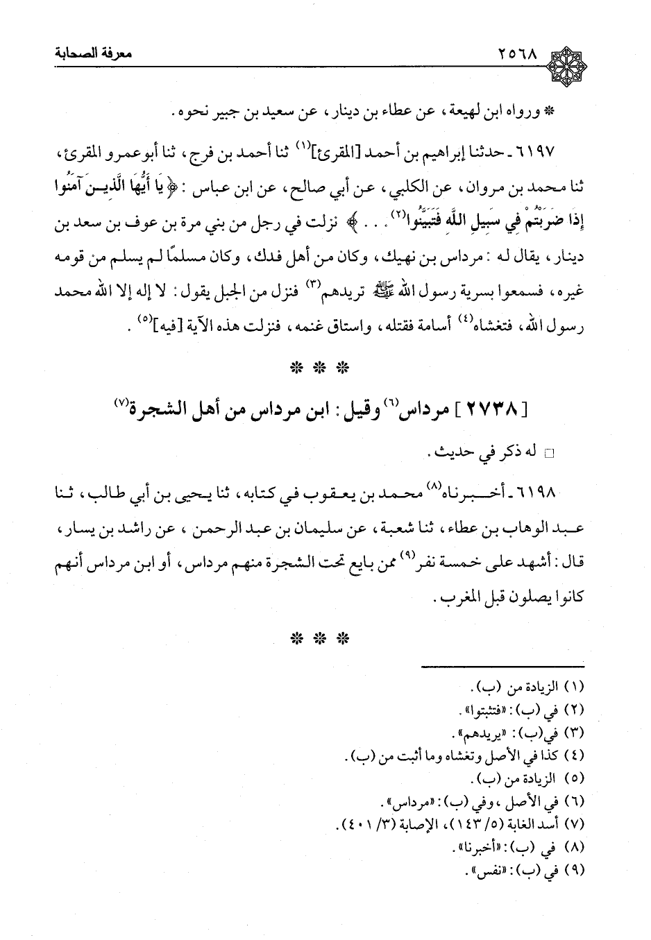 ٦١٩٧ - حَدَّثَنَا إِبْرَاهِيمُ بْنُ أَحْمَدَ الْمُقْرِئُ، ثنا أَحْمَدُ بْنُ فَرَجٍ، ثنا أَبُو عَمْرٍو الْمُقْرِئُ، ثنا مُحَمَّدُ بْنُ مَرْوَانَ، عَنِ الْكَلْبِيِّ، عَنْ أَبِي صَالِحٍ، عَنِ ابْنِ عَبَّاسٍ: " {يَا أَيُّهَا الَّذِينَ آمَنُوا إِذَا ضَرَبْتُمْ فِي سَبِيلِ اللهِ فَتَبَيَّنُوا} [النساء: ٩٤] نَزَلَتْ فِي رَجُلٍ مِنْ بَنِي مُرَّةَ بْنِ عَوْفِ بْنِ سَعْدِ بْنِ دِينَارٍ، يُقَالُ لَهُ: مِرْدَاسُ بْنُ نَهِيكٍ، وَكَانَ مِنْ أَهْلِ فَدَكٍ، وَكَانَ مُسْلِمًا , لَمْ يُسْلِمْ مِنْ قَوْمِهِ غَيْرُهُ، فَسَمِعُوا بِسَرِيَّةِ رَسُولِ اللهِ صَلَّى اللَّهُ عَلَيْهِ وَسَلَّمَ تُرِيدُهُمْ، فَنَزَلَ مِنَ الْجَبَلِ يَقُولُ: لَا إِلَهَ إِلَّا اللهُ، مُحَمَّدٌ رَسُولُ اللهِ، فَتَغَشَّاهُ أُسَامَةُ فَقَتَلَهُ، وَاسْتَاقَ غَنَمَهُ، فَنَزَلَتْ هَذِهِ الْآيَةُ فِيهِ "