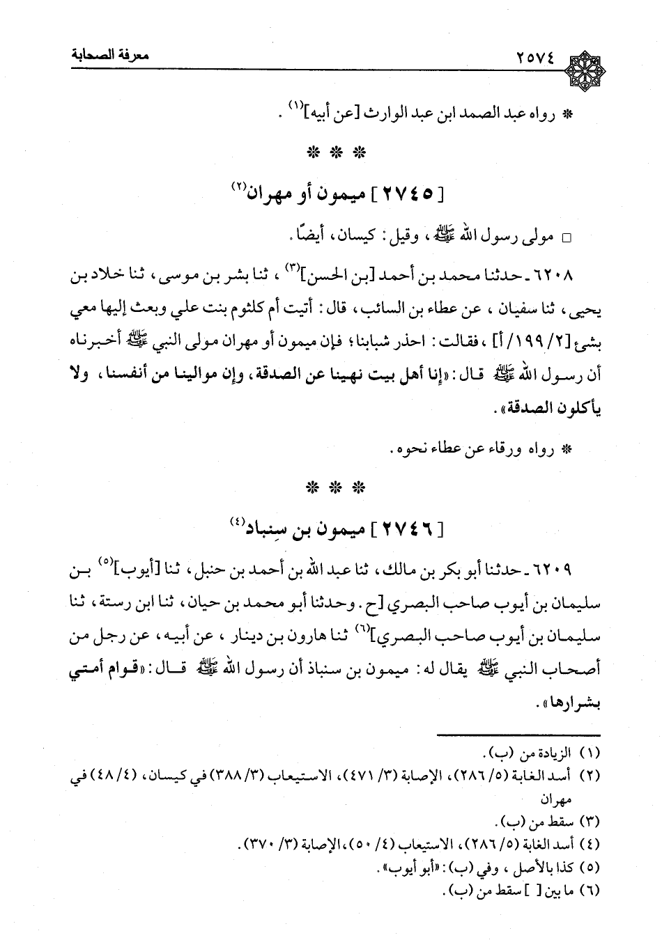 ٦٢٠٩ - حَدَّثَنَا أَبُو بَكْرِ بْنُ مَالِكٍ، ثنا عَبْدُ اللهِ بْنُ أَحْمَدَ بْنِ حَنْبَلٍ، ثنا أَيُّوبُ بْنُ سُلَيْمَانَ بْنِ أَيُّوبَ صَاحِبُ الْبَصْرِيِّ ح، وَحَدَّثَنَا أَبُو مُحَمَّدِ بْنُ حَيَّانَ، ثنا ابْنُ رُسْتَةَ، ثنا سُلَيْمَانُ بْنُ أَيُّوبَ صَاحِبُ الْبَصْرِيِّ، ثنا هَارُونُ بْنُ دِينَارٍ، عَنْ أَبِيهِ، عَنْ رَجُلٍ مِنْ أَصْحَابِ النَّبِيِّ صَلَّى اللَّهُ عَلَيْهِ وَسَلَّمَ يُقَالُ لَهُ: مَيْمُونُ بْنُ سِنْبَاذَ , أَنَّ رَسُولَ اللهِ صَلَّى اللَّهُ عَلَيْهِ وَسَلَّمَ قَالَ: «قِوَامُ أُمَّتِي بِشِرَارِهَا» ⦗٢٥٧٥⦘ رَوَاهُ إِبْرَاهِيمُ بْنُ عَبْدِ الرَّحْمَنِ بْنِ مَهْدِيٍّ، عَنْ هَارُونَ، فَقَالَ: قَالَ هَارُونُ: ذَهَبْتُ أَنَا وَالْحَسَنُ جَمِيعًا حَتَّى سَمِعْنَاهُ مِنْهُ وَرَوَاهُ مُعْتَمِرُ بْنُ سُلَيْمَانَ، عَنْ أَبِيهِ، عَنْ مَيْمُونِ بْنِ سِنْبَاذَ