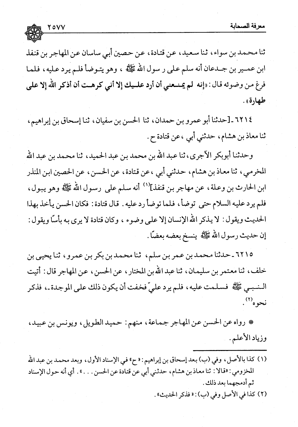 ٦٢١٥ - حَدَّثَنَا مُحَمَّدُ بْنُ عُمَرَ بْنِ سَلْمٍ، ثنا مُحَمَّدُ بْنُ بَكْرِ بْنِ عَمْرٍو، ثنا يَحْيَى بْنُ خَلَفٍ، ثنا مُعْتَمِرُ بْنُ سُلَيْمَانَ، ثنا عَبْدُ اللهِ بْنُ الْمُخْتَارِ، عَنِ الْحَسَنِ، عَنِ الْمُهَاجِرِ، قَالَ: أَتَيْتُ النَّبِيَّ صَلَّى اللَّهُ عَلَيْهِ وَسَلَّمَ , فَسَلَّمْتُ عَلَيْهِ، فَلَمْ يَرُدَّ عَلَيَّ , فَخِفْتُ أَنْ يَكُونَ ذَلِكَ عَلَى الْمَوْجِدَةِ، فَذَكَرَ نَحْوَهُ رَوَاهُ عَنِ الْحَسَنِ، عَنِ الْمُهَاجِرِ جَمَاعَةٌ، مِنْهُمْ: حُمَيْدٌ الطَّوِيلُ، وَيُونُسُ بْنُ عُبَيْدٍ، وَزِيَادٌ الْأَعْلَمُ، ⦗٢٥٧٨⦘ وَجَوَّدَهُ هِشَامٌ، عَنْ قَتَادَةَ، عَنِ الْحَسَنِ، فَأَدْخَلَ حُصَيْنُ بْنُ الْمُنْذِرِ بَيْنَهُ وَبَيْنَ الْمُهَاجِرِ، وَرَوَاهُ أَبُو عُبَيْدَةَ النَّاجِيُّ، عَنِ الْحَسَنِ، عَنِ الْبَرَاءِ بْنِ عَازِبٍ، فَخَالَفَ أَصْحَابَ الْحَسَنِ، وَأَبُو عُبَيْدَةَ ضَعِيفٌ , مُضْطَرِبُ الْحِفْظِ