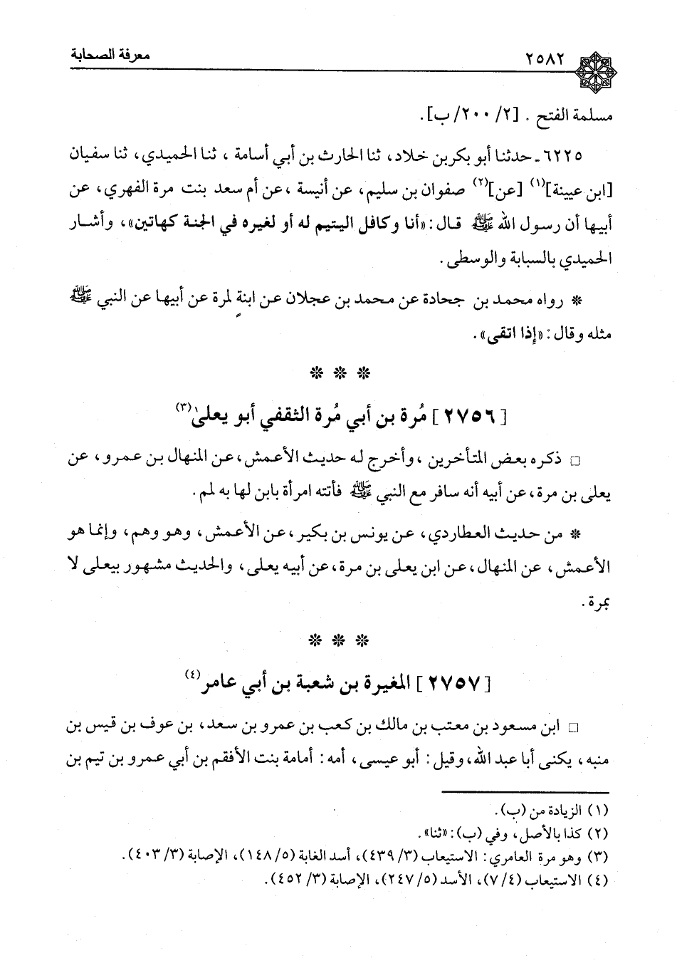 ٦٢٢٥ - حَدَّثَنَا أَبُو بَكْرِ بْنُ خَلَّادٍ، ثنا الْحَارِثُ بْنُ أَبِي أُسَامَةَ، ثنا الْحُمَيْدِيُّ، ثنا سُفْيَانُ بْنُ عُيَيْنَةَ، عَنْ صَفْوَانَ بْنِ سُلَيْمٍ، عَنْ أُنَيْسَةَ، عَنْ أُمِّ سَعْدِ بِنْتِ مُرَّةَ الْفِهْرِيِّ، عَنْ أَبِيهَا،: " أَنَّ رَسُولَ اللهِ صَلَّى اللَّهُ عَلَيْهِ وَسَلَّمَ قَالَ: «أَنَا وَكَافِلُ الْيَتِيمِ لَهُ , أَوْ لِغَيْرِهِ فِي الْجَنَّةِ كَهَاتَيْنِ» وَأَشَارَ الْحُمَيْدِيُّ بِالسَّبَّابَةِ وَالْوُسْطَى " رَوَاهُ مُحَمَّدُ بْنُ جُحَادَةَ، عَنْ مُحَمَّدِ بْنِ عَجْلَانَ، عَنِ ابْنَةٍ لِمُرَّةَ، عَنْ أَبِيهَا , عَنِ النَّبِيِّ صَلَّى اللَّهُ عَلَيْهِ وَسَلَّمَ مِثْلَهُ , وَقَالَ: «إِذَا اتَّقَى»