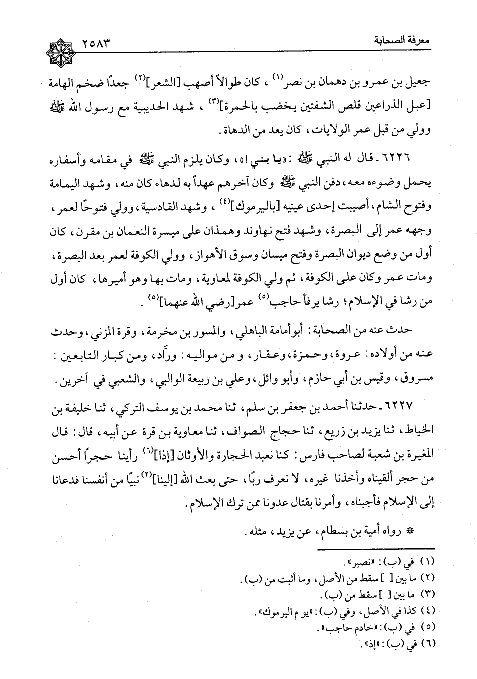 ٦٢٢٧ - حَدَّثَنَا أَحْمَدُ بْنُ جَعْفَرِ بْنِ سَلْمٍ، ثنا مُحَمَّدُ بْنُ يُوسُفَ التُّرْكِيُّ، ثنا خَلِيفَةُ بْنُ الْخَيَّاطِ، ثنا يَزِيدُ بْنُ زُرَيْعٍ، ثنا حَجَّاجٌ الصَّوَّافُ، ثنا مُعَاوِيَةُ بْنُ قُرَّةَ، عَنْ أَبِيهِ، قَالَ: قَالَ الْمُغِيرَةُ بْنُ شُعْبَةَ لِصَاحِبِ فَارِسَ: «كُنَّا نَعْبُدُ الْحِجَارَةَ وَالْأَوْثَانَ , إِذَا رَأَيْنَا حَجَرًا أَحْسَنَ مِنْ حَجَرٍ أَلْقَيْنَاهُ , وَأَخَذْنَا غَيْرَهُ، لَا نَعْرِفُ رَبًّا، حَتَّى بَعَثَ اللهُ إِلَيْنَا نَبِيًّا مِنْ أَنْفُسِنَا , فَدَعَانَا إِلَى الْإِسْلَامِ فَأَجَبْنَاهُ، وَأَمَرَنَا بِقِتَالِ عَدُوِّنَا مِمَّنْ تَرَكَ الْإِسْلَامَ» رَوَاهُ أُمَيَّةُ بْنُ بِسْطَامٍ، عَنْ يَزِيدَ، مِثْلَهُ، ⦗٢٥٨٤⦘ وَرَوَاهُ عَنِ الْمُغِيرَةِ: زِيَادُ بْنُ جُبَيْرِ بْنِ حَيَّةَ، عَنْ أَبِيهِ، عَنِ الْمُغِيرَةِ مِثْلَهُ، وَرَوَى عَنْ أَبِي دَاوُدَ، عَنْ مَسْلَمَةَ، عَنْ دَاوُدَ بْنِ أَبِي هِنْدٍ، عَنِ الشَّعْبِيِّ، عَنْ مُغِيرَةَ