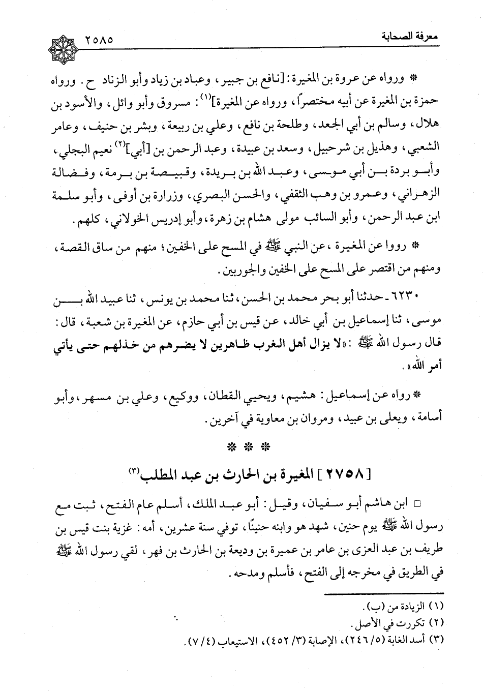 الْمُغِيرَةُ بْنُ الْحَارِثِ بْنِ عَبْدِ الْمُطَّلِبِ بْنِ هَاشِمٍ أَبُو سُفْيَانَ، وَقِيلَ: أَبُو عَبْدِ الْمَلِكِ، أَسْلَمَ عَامَ الْفَتْحِ، ثَبَتَ مَعَ رَسُولِ اللهِ صَلَّى اللَّهُ عَلَيْهِ وَسَلَّمَ يَوْمَ حُنَيْنٍ، شَهِدَ هُوَ وَابْنُهُ حُنَيْنًا، تُوُفِّيَ سَنَةَ عِشْرِينَ، أُمُّهُ: غَزِيَّةُ بِنْتُ قَيْسِ بْنِ طَرِيفِ بْنِ عَبْدِ الْعُزَّى بْنِ عَامِرِ بْنِ عَمِيرَةَ بْنِ وَدِيعَةَ بْنِ الْحَارِثِ بْنِ فِهْرٍ، لَقِيَ رَسُولَ اللهِ صَلَّى اللَّهُ عَلَيْهِ وَسَلَّمَ فِي الطَّرِيقِ فِي مَخْرَجِهِ إِلَى الْفَتْحِ، فَأَسْلَمَ وَمَدَحَهُ