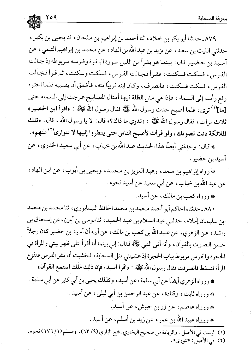 ٨٨٠ - حَدَّثَنَاهُ الْحَاكِمُ أَبُو أَحْمَدَ مُحَمَّدُ بْنُ مُحَمَّدٍ الْحَافِظُ النَّيْسَابُورِيُّ، ثنا مُحَمَّدُ بْنُ مُحَمَّدِ بْنِ سُلَيْمَانَ، إِمْلَاءً، حَدَّثَنِي عَبْدُ السَّلَامِ بْنُ عَبْدِ الْحَمِيدِ، ثنا مُوسَى بْنُ أَعْيَنَ، عَنْ إِسْحَاقَ بْنِ رَاشِدٍ، عَنِ الزُّهْرِيِّ، عَنْ عَبْدِ اللهِ بْنِ كَعْبِ بْنِ مَالِكٍ، عَنْ أَبِيهِ، أَنَّ أُسَيْدِ بْنِ حُضَيْرٍ، كَانَ رَجُلًا حَسَنَ الصَّوْتِ بِالْقُرْآنِ، وَأَنَّهُ أَتَى النَّبِيَّ صَلَّى اللَّهُ عَلَيْهِ وَسَلَّمَ فَقَالَ: إِنِّي بَيْنَمَا أَنَا أَقْرَأُ عَلَى ظَهْرِ بَيْتِي وَالْمَرْأَةُ فِي الْحُجْرَةِ، وَالْفَرَسُ مَرْبُوطٌ بِبَابِ الْحُجْرَةِ، إِذْ غَشِيَتْنِي مِثْلُ السَّحَابَةِ، فَخَشِيتُ أَنْ يَنْفِرَ الْفَرَسُ فَتَفْزَعَ الْمَرْأَةُ فَتَسْقُطَ، فَانْصَرَفْتُ، فَقَالَ رَسُولُ اللهِ صَلَّى اللَّهُ عَلَيْهِ وَسَلَّمَ: «اقْرَأْ أُسَيْدُ، فَإِنَّ ذَلِكَ مَلَكٌ اسْتَمَعَ الْقُرْآنَ» وَرَوَاهُ الزُّهْرِيُّ أَيْضًا، عَنْ أَبِي سَلَمَةَ، عَنْ أُسَيْدٍ، وَكَذَلِكَ يَحْيَى بْنُ أَبِي كَثِيرٍ، عَنْ أَبِي سَلَمَةَ، وَرَوَاهُ ثَابِتٌ، وَقَتَادَةُ، عَنْ عَبْدِ الرَّحْمَنِ بْنِ أَبِي لَيْلَى، عَنْ أُسَيْدٍ، وَرَوَاهُ عَاصِمٌ، عَنْ زِرِّ بْنِ حُبَيْشٍ، عَنْ أُسَيْدٍ، وَرَوَاهُ عُبَيْدُ اللهِ بْنُ عُمَرَ، عَنْ زَيْدِ بْنِ أَسْلَمَ، عَنْ أُسَيْدٍ
