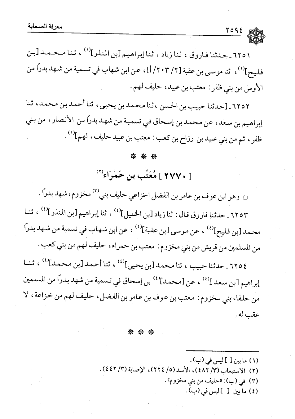 ٦٢٥٤ - حَدَّثَنَا حَبِيبٌ، ثنا مُحَمَّدُ بْنُ يَحْيَى، ثنا أَحْمَدُ بْنُ مُحَمَّدٍ، ثنا إِبْرَاهِيمُ بْنُ سَعْدٍ، عَنْ مُحَمَّدِ بْنِ إِسْحَاقَ: " فِي تَسْمِيَةِ مَنْ شَهِدَ بَدْرًا مِنَ الْمُسْلِمِينَ مِنْ حُلَفَاءِ بَنِي مَخْزُومٍ: مُعَتِّبُ بْنُ عَوْفِ بْنِ عَامِرِ بْنِ الْفَضْلِ، حَلِيفٌ لَهُمْ مِنْ خُزَاعَةَ، لَا عَقِبَ لَهُ "