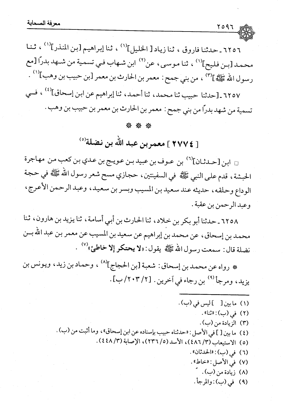 ٦٢٥٦ - حَدَّثَنَا فَارُوقٌ، ثنا زِيَادُ بْنُ الْخَلِيلِ، ثنا إِبْرَاهِيمُ بْنُ الْمُنْذِرِ، ثنا مُحَمَّدُ بْنُ فُلَيْحٍ، ثنا مُوسَى، عَنِ ابْنِ شِهَابٍ: " فِي تَسْمِيَةِ مَنْ شَهِدَ بَدْرًا مَعَ رَسُولِ اللهِ صَلَّى اللَّهُ عَلَيْهِ وَسَلَّمَ، مِنْ بَنِي جُمَحٍ: مَعْمَرُ بْنُ الْحَارِثِ بْنِ مَعْمَرِ بْنِ حَبِيبِ بْنِ وَهْبٍ "