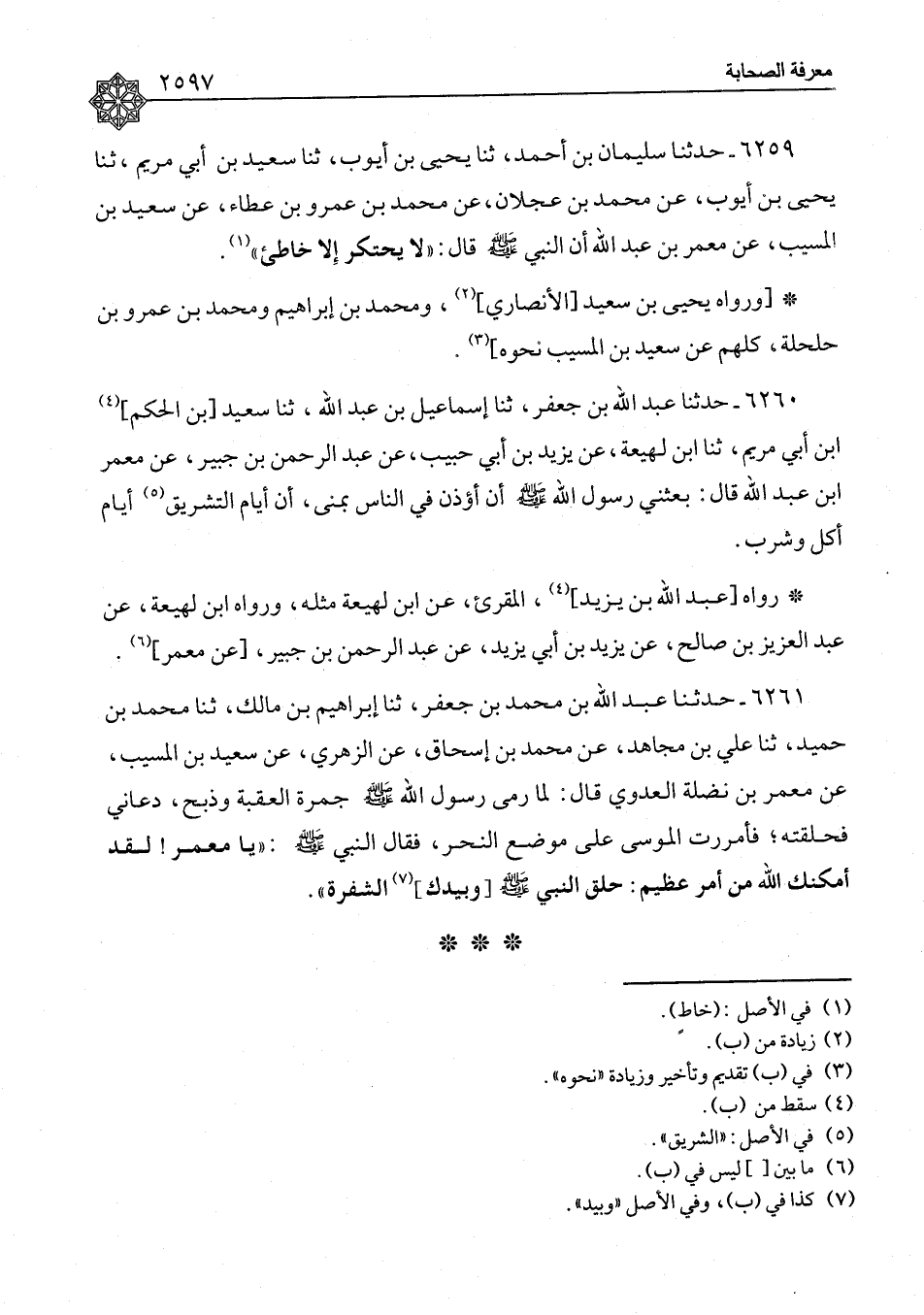 ٦٢٦١ - حَدَّثَنَا عَبْدُ اللهِ بْنُ مُحَمَّدِ بْنِ جَعْفَرٍ، ثنا إِبْرَاهِيمُ بْنُ مَالِكٍ، ثنا مُحَمَّدُ بْنُ حُمَيْدٍ، ثنا عَلِيُّ بْنُ مُجَاهِدٍ، عَنْ مُحَمَّدِ بْنِ إِسْحَاقَ، عَنِ الزُّهْرِيِّ، عَنْ سَعِيدِ بْنِ الْمُسَيِّبِ، عَنْ مَعْمَرِ بْنِ نَضْلَةَ الْعَدَوِيِّ، قَالَ: " لَمَّا رَمَى رَسُولُ اللهِ صَلَّى اللَّهُ عَلَيْهِ وَسَلَّمَ جَمْرَةَ الْعَقَبَةِ وَذَبَحَ، دَعَانِي فَحَلَقْتُهُ، فَأَمْرَرْتُ الْمُوسَى عَلَى مَوْضِعِ النَّحْرِ، فَقَالَ النَّبِيُّ صَلَّى اللَّهُ عَلَيْهِ وَسَلَّمَ: " يَا مَعْمَرُ لَقَدْ أَمْكَنَكَ اللهُ مِنْ أَمْرٍ عَظِيمٍ: حَلْقِ النَّبِيِّ صَلَّى اللَّهُ عَلَيْهِ وَسَلَّمَ , وَبِيَدِكَ الشَّفْرَةُ "