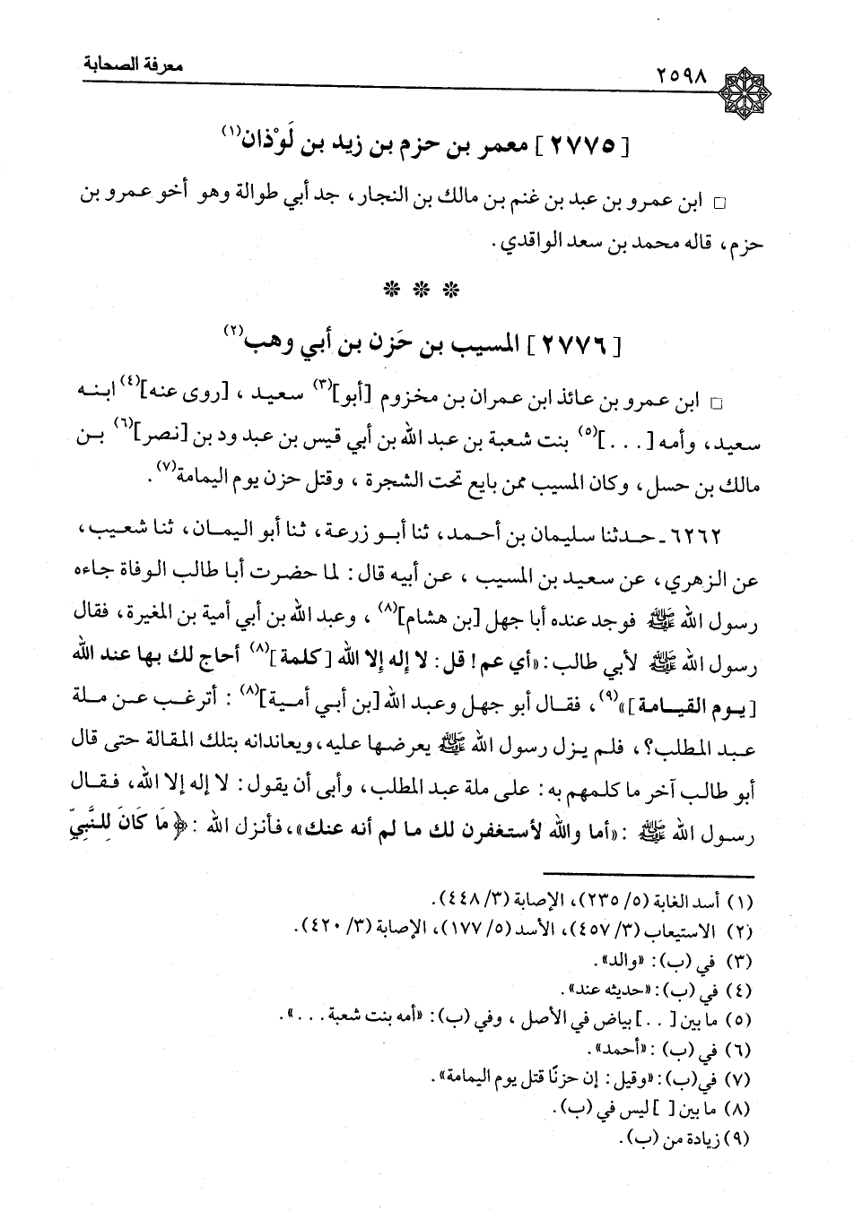 ٦٢٦٢ - حَدَّثَنَا سُلَيْمَانُ بْنُ أَحْمَدَ، ثنا أَبُو زُرْعَةَ، ثنا أَبُو الْيَمَانِ، ثنا شُعَيْبٌ، عَنِ الزُّهْرِيِّ، عَنْ سَعِيدِ بْنِ الْمُسَيِّبِ، عَنْ أَبِيهِ، قَالَ: " لَمَّا حَضَرَتْ أَبَا طَالِبٍ الْوَفَاةُ , جَاءَهُ رَسُولُ اللهِ صَلَّى اللَّهُ عَلَيْهِ وَسَلَّمَ , فَوَجَدَ عِنْدَهُ أَبَا جَهْلِ بْنَ هِشَامٍ، وَعَبْدَ اللهِ بْنَ أَبِي أُمَيَّةَ بْنِ الْمُغِيرَةِ، فَقَالَ رَسُولُ اللهِ صَلَّى اللَّهُ عَلَيْهِ وَسَلَّمَ لِأَبِي طَالِبٍ: " أَيْ عَمِّ قُلْ: لَا إِلَهَ إِلَّا اللهُ , كَلِمَةٌ أُحَاجُّ لَكَ بِهَا عِنْدَ اللهِ يَوْمَ الْقِيَامَةِ "، فَقَالَ أَبُو جَهْلٍ , وَعَبْدُ اللهِ بْنُ أَبِي أُمَيَّةَ: أَتَرْغَبُ عَنْ مِلَّةِ عَبْدِ الْمُطَّلِبِ؟ فَلَمْ يَزَلْ رَسُولُ اللهِ صَلَّى اللَّهُ عَلَيْهِ وَسَلَّمَ يَعْرِضُهَا عَلَيْهِ، وَيُعَانِدَانِهِ بِتِلْكَ الْمَقَالَةِ , حَتَّى قَالَ أَبُو طَالِبٍ آخِرَ مَا كَلَّمَهُمْ بِهِ: عَلَى مِلَّةِ عَبْدِ الْمُطَّلِبِ وَأَبِي أَنْ يَقُولَ: لَا إِلَهَ إِلَّا اللهُ، فَقَالَ رَسُولُ اللهِ صَلَّى اللَّهُ عَلَيْهِ وَسَلَّمَ: «أَمَا وَاللهِ لَأَسْتَغْفِرَنَّ لَكَ مَا لَمْ أُنْهَ عَنْكَ» ، فَأَنْزَلَ اللهُ: {مَا كَانَ لِلنَّبِيِّ ⦗٢٥٩٩⦘ وَالَّذِينَ آمَنُوا أَنْ يَسْتَغْفِرُوا لِلْمُشْرِكِينَ وَلَوْ كَانُوا أُولِي قُرْبَى مِنْ بَعْدِ مَا تَبَيَّنَ لَهُمْ أَنَّهُمْ أَصْحَابُ الْجَحِيمِ} [التوبة: ١١٣] ، وَأَنْزَلَ اللهُ فِي أَبِي طَالِبٍ: {إِنَّكَ لَا تَهْدِي مَنْ أَحْبَبْتَ وَلَكِنَّ اللهَ يَهْدِي مَنْ يَشَاءُ} [القصص: ٥٦] رَوَاهُ صَالِحُ بْنُ كَيْسَانَ، وَيُونُسُ، وَمَعْمَرٌ، فِي آخَرِينَ، عَنِ الزُّهْرِيِّ
