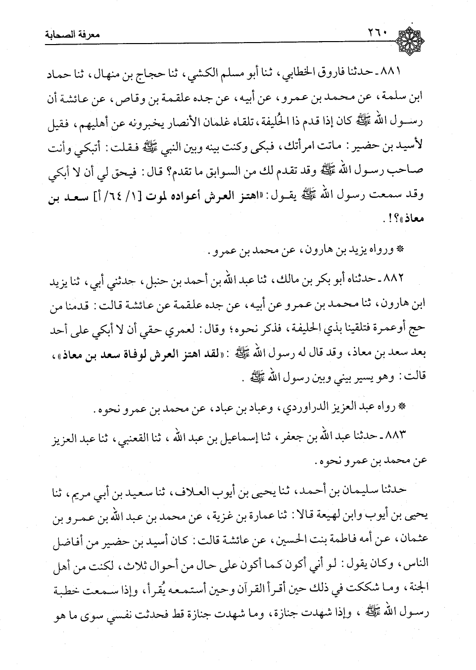 ٨٨١ - حَدَّثَنَا فَارُوقٌ الْخَطَّابِيُّ، ثنا أَبُو مُسْلِمٍ الْكَشِّيُّ، ثنا حَجَّاجُ بْنُ مِنْهَالٍ، ثنا حَمَّادُ بْنُ سَلَمَةَ، عَنْ مُحَمَّدِ بْنِ عَمْرٍو، عَنْ أَبِيهِ، عَنْ جَدِّهِ عَلْقَمَةَ بْنِ وَقَّاصٍ، عَنْ عَائِشَةَ، أَنَّ رَسُولَ اللهِ صَلَّى اللَّهُ عَلَيْهِ وَسَلَّمَ كَانَ إِذَا قَدِمَ ذَا الْحُلَيْفَةَ تَلَقَّاهُ غِلْمَانُ الْأَنْصَارِ يُخْبِرُونَهُ عَنْ أَهْلِيهِمْ، فَقِيلَ لِأُسَيْدِ بْنِ حُضَيْرٍ: مَاتَتِ امْرَأَتُكَ، فَبَكَى، وَكُنْتُ بَيْنَهُ وَبَيْنَ النَّبِيِّ صَلَّى اللَّهُ عَلَيْهِ وَسَلَّمَ، فَقُلْتُ: أَتَبْكِي وَأَنْتَ صَاحِبُ رَسُولِ اللهِ صَلَّى اللَّهُ عَلَيْهِ وَسَلَّمَ، وَقَدْ تَقَدَّمَ لَكَ مِنَ السَّوَابِقِ مَا تَقَدَّمَ؟ قَالَ: فَيِحِقُّ لِي أَنْ لَا أَبْكِي وَقَدْ سَمِعْتُ رَسُولَ اللهِ صَلَّى اللَّهُ عَلَيْهِ وَسَلَّمَ يَقُولُ: «اهْتَزَّ الْعَرْشُ أَعْوَادُهُ لِمَوْتِ سَعْدِ بْنِ مُعَاذٍ» وَرَوَاهُ يَزِيدُ بْنُ هَارُونَ، عَنْ مُحَمَّدِ بْنِ عَمْرٍو
