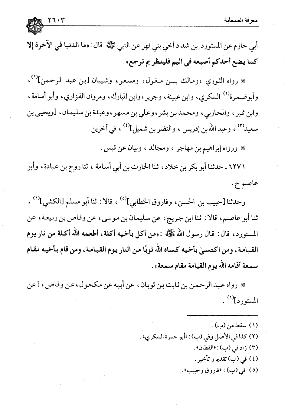 ٦٢٧١ - حَدَّثَنَا أَبُو بَكْرِ بْنُ خَلَّادٍ، ثنا الْحَارِثُ بْنُ أَبِي أُسَامَةَ، ثنا رَوْحُ بْنُ عُبَادَةَ، وَأَبُو عَاصِمٍ , ح، وَحَدَّثَنَا حَبِيبُ بْنُ الْحَسَنِ، وَفَارُوقٌ الْخَطَّابِيُّ، قَالَا: ثنا أَبُو مُسْلِمٍ الْكَشِّيُّ، ثنا أَبُو عَاصِمٍ، قَالَا: ثنا ابْنُ جُرَيْجٍ، عَنْ سُلَيْمَانَ بْنِ مُوسَى، عَنْ وَقَّاصِ بْنِ رَبِيعَةَ، عَنِ الْمُسْتَوْرِدِ، قَالَ: قَالَ رَسُولُ اللهِ صَلَّى اللَّهُ عَلَيْهِ وَسَلَّمَ: «مَنْ أَكَلَ بِأَخِيهِ أَكْلَةً، أَطْعَمَهُ اللهُ أَكْلَةً مِنْ نَارِ يَوْمِ الْقِيَامَةِ، وَمَنِ اكْتَسَى بِأَخِيهِ كَسَاهُ اللهُ ثَوْبًا مِنَ النَّارِ يَوْمَ الْقِيَامَةِ، وَمَنْ قَامَ بِأَخِيهِ مَقَامَ سُمْعَةٍ أَقَامَهُ اللهُ يَوْمَ الْقِيَامَةِ مَقَامَ سُمْعَةٍ» رَوَاهُ عَبْدُ الرَّحْمَنِ بْنُ ثَابِتِ بْنِ ثَوْبَانَ، عَنْ أَبِيهِ، عَنْ مَكْحُولٍ، عَنْ وَقَّاصٍ، عَنِ الْمُسْتَوْرِدِ