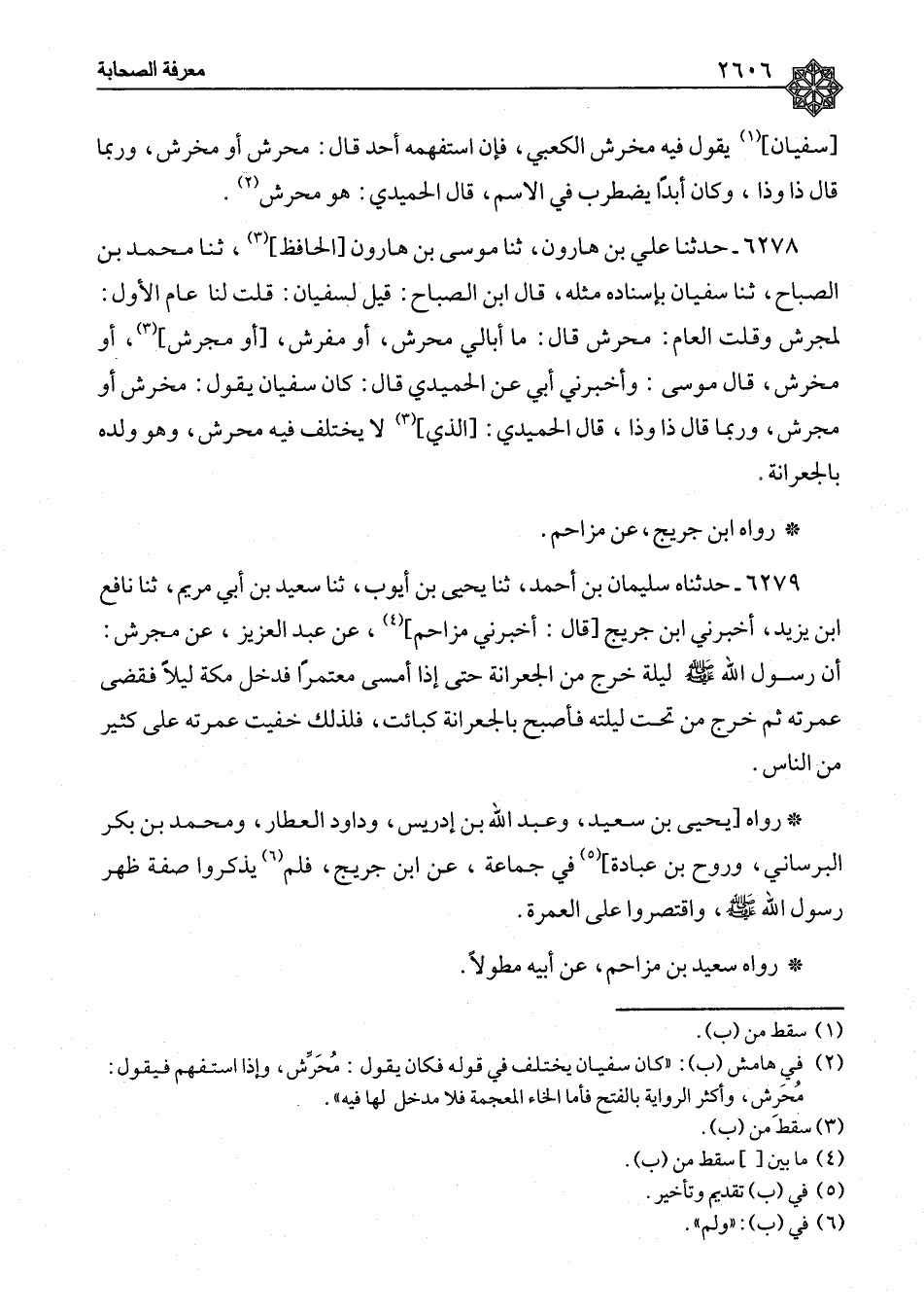 ٦٢٧٩ - حَدَّثَنَاهُ سُلَيْمَانُ بْنُ أَحْمَدَ، ثنا يَحْيَى بْنُ أَيُّوبَ، ثنا سَعِيدُ بْنُ أَبِي مَرْيَمَ، ثنا نَافِعُ بْنُ يَزِيدَ، أَخْبَرَنِي ابْنُ جُرَيْجٍ، قَالَ: أَخْبَرَنِي مُزَاحِمٌ، عَنْ عَبْدِ الْعَزِيزِ، عَنْ مِحْرَشٍ: «أَنَّ رَسُولَ اللهِ صَلَّى اللَّهُ عَلَيْهِ وَسَلَّمَ لَيْلَةَ خَرَجَ مِنَ الْجِعْرَانَةِ حَتَّى إِذَا أَمْسَى مُعْتَمِرًا، فَدَخَلَ مَكَّةَ لَيْلًا , فَقَضَى عُمْرَتَهُ , ثُمَّ خَرَجَ مِنْ تَحْتِ لَيْلَتِهِ , فَأَصْبَحَ بِالْجِعْرَانَةِ كَبَائِتٍ، فَلِذَلِكَ خَفِيَتْ عُمْرَتُهُ عَلَى كَثِيرٍ مِنَ النَّاسِ» رَوَاهُ يَحْيَى بْنُ سَعِيدٍ، وَعَبْدُ اللهِ بْنُ إِدْرِيسَ، وَدَاوُدُ الْعَطَّارُ، وَمُحَمَّدُ بْنُ بَكْرٍ الْبُرْسَانِيُّ، وَرَوْحُ بْنُ عُبَادَةَ، فِي جَمَاعَةٍ، عَنِ ابْنِ جُرَيْجٍ، فَلَمْ يَذْكُرُوا صِفَةَ ظَهْرِ رَسُولِ اللهِ صَلَّى اللَّهُ عَلَيْهِ وَسَلَّمَ، وَاقْتَصَرُوا عَلَى الْعُمْرَةِ رَوَاهُ سَعِيدُ بْنُ مُزَاحِمٍ، عَنْ أَبِيهِ مُطَوَّلًا