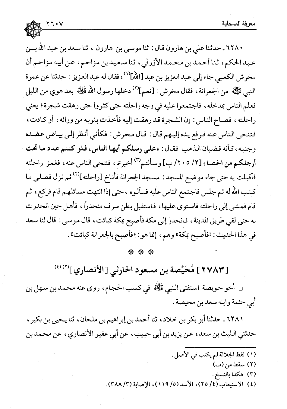 ٦٢٨٠ - حَدَّثَنَا عَلِيُّ بْنُ هَارُونَ، قَالَ: ثنا مُوسَى بْنُ هَارُونَ، ثنا سَعْدُ بْنُ عَبْدِ اللهِ بْنِ عَبْدِ الْحَكَمِ، ثنا أَحْمَدُ بْنُ مُحَمَّدٍ الْأَزْرَقِيُّ، ثنا سَعِيدُ بْنُ مُزَاحِمٍ، عَنْ أَبِيهِ مُزَاحِمٍ , أَنَّ مُخَرِّشًا الْكَعْبِيَّ، جَاءَ إِلَى عَبْدِ الْعَزِيزِ بْنِ عَبْدِ اللهِ، فَقَالَ لَهُ عَبْدُ الْعَزِيزِ: حَدِّثْنَا عَنْ عُمْرَةِ النَّبِيِّ صَلَّى اللَّهُ عَلَيْهِ وَسَلَّمَ مِنَ الْجِعْرَانَةِ، فَقَالَ مُخَرِّشٌ: " نَعَمْ , دَخَلَهَا رَسُولُ اللهِ صَلَّى اللَّهُ عَلَيْهِ وَسَلَّمَ بَعْدَ هَوِيٍّ مِنَ اللَّيْلِ , فَعَلِمَ النَّاسُ بِمَدْخَلِهِ، فَاجْتَمَعُوا عَلَيْهِ فِي وَجْهِ رَاحِلَتِهِ حَتَّى كَثُرُوا , حَتَّى رَهِقَتْ شَجْرَةٌ، يَعْنِي رَاحِلَتَهُ، فَصَاحَ النَّاسُ: إِنَّ الشَّجَرَةَ قَدْ رَهِقَتْ إِلَيْهِ , فَأَخَذَتْ بِثَوْبِهِ مِنْ وَرَائِهِ، أَوْ كَادَتْ، فَتَنَحَّى النَّاسُ عَنْهُ , فَرَفَعَ يَدَهُ إِلَيْهِمْ , قَالَ: قَالَ مُحَرِّشٌ: فَكَأَنِّي أَنْظُرُ إِلَى بَيَاضِ عَضُدِهِ وَجَنْبِهِ، كَأَنَّهُ قُضْبَانُ الذَّهَبِ، فَقَالَ: «عَلَى رِسْلِكُمْ أَيُّهَا النَّاسُ، فَلَوْ كُنْتُمْ عَدَدَ مَا تَحْتَ أَرْجُلِكُمْ مِنَ الْحَصَا , وَسَأَلْتُمْ أُخْبِرْتُمْ» فَتَنَحَّى النَّاسُ عَنْهُ، فَغَمَزَ رَاحِلَتَهُ، فَأَقْبَلَتْ بِهِ حَتَّى جَاءَ مَوْضِعَ الْمَسْجِدِ: مَسْجِدِ الْجِعْرَانَةِ , فَأَنَاخَ رَاحِلَتَهُ، ثُمَّ نَزَلَ , فَصَلَّى مَا كَتَبَ اللهُ لَهُ , ثُمَّ جَلَسَ , فَاجْتَمَعَ النَّاسُ عَلَيْهِ , فَسَأَلُوهُ، حَتَّى إِذَا انْتَهَتْ مَسَائِلُهُمْ قَامَ فَرَكَعَ، ثُمَّ قَامَ، فَمَشَى إِلَى رَاحِلَتِهِ , فَاسْتَوَى عَلَيْهَا، فَاسْتَقْبَلَ بَطْنَ سَرِفٍ مُنْحَدِرًا، فَأَهَلَّ حِينَ انْحَدَرَتْ بِهِ حَتَّى لَقِيَ طَرِيقَ الْمَدِينَةِ، فَانْحَدَرَ إِلَى مَكَّةَ , فَأَصْبَحَ بِمَكَّةَ كَبَائِتٍ " قَالَ مُوسَى: قَالَ لَنَا سَعْدٌ: فِي هَذَا الْحَدِيثِ: فَأَصْبَحَ بِمَكَّةَ , وَهْمٌ، إِنَّمَا هُوَ: «فَأَصْبَحَ بِالْجِعْرَانَةِ كَبَائِتٍ»