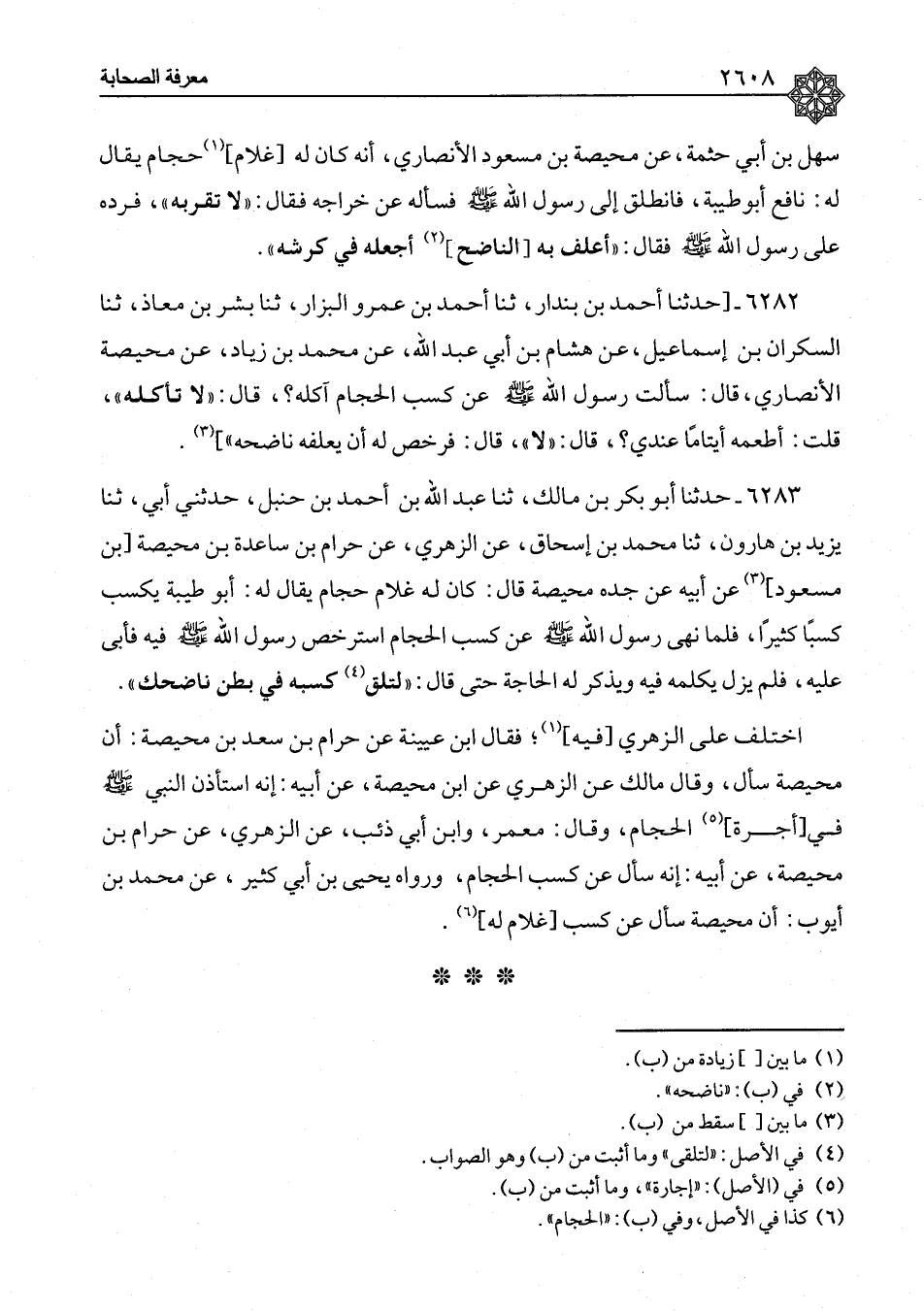 ٦٢٨٣ - حَدَّثَنَا أَبُو بَكْرِ بْنُ مَالِكٍ، ثنا عَبْدُ اللهِ بْنُ أَحْمَدَ بْنِ حَنْبَلٍ، حَدَّثَنِي أَبِي، ثنا يَزِيدُ بْنُ هَارُونَ، ثنا مُحَمَّدُ بْنُ إِسْحَاقَ، عَنِ الزُّهْرِيِّ، عَنْ حَرَامِ بْنِ سَاعِدَةَ بْنِ مُحَيِّصَةَ بْنِ مَسْعُودٍ، عَنْ أَبِيهِ، عَنْ جَدِّهِ مُحَيِّصَةَ قَالَ: " كَانَ لَهُ غُلَامٌ حَجَّامٌ يُقَالُ لَهُ: أَبُو طَيْبَةَ , يَكْسِبُ كَسْبًا كَثِيرًا، فَلَمَّا نَهَى رَسُولُ اللهِ صَلَّى اللَّهُ عَلَيْهِ وَسَلَّمَ عَنْ كَسْبِ الْحَجَّامِ اسْتَرْخَصَ رَسُولَ اللهِ صَلَّى اللَّهُ عَلَيْهِ وَسَلَّمَ فِيهِ , فَأَبَى عَلَيْهِ، فَلَمْ يَزَلْ يُكَلِّمُهُ فِيهِ , وَيَذْكُرُ لَهُ الْحَاجَةَ حَتَّى قَالَ: «لِتُلْقِ كَسْبَهُ فِي بَطْنِ نَاضِحِكَ» اخْتُلِفَ عَلَى الزُّهْرِيِّ فِيهِ، فَقَالَ ابْنُ عُيَيْنَةَ: عَنْ حَرَامِ بْنِ سَعْدِ بْنِ مُحَيِّصَةَ: أَنَّ مُحَيِّصَةَ سَأَلَ وَقَالَ مَالِكٌ: عَنِ الزُّهْرِيِّ، عَنِ ابْنِ مُحَيِّصَةَ، عَنْ أَبِيهِ: أَنَّهُ اسْتَأْذَنَ النَّبِيَّ صَلَّى اللَّهُ عَلَيْهِ وَسَلَّمَ فِي أُجْرَةِ الْحَجَّامِ وَقَالَ مَعْمَرٌ، وَابْنُ أَبِي ذِئْبٍ، عَنِ الزُّهْرِيِّ، عَنْ حَرَامِ بْنِ مُحَيِّصَةَ، عَنْ أَبِيهِ: أَنَّهُ سَأَلَ عَنْ كَسْبِ الْحَجَّامِ وَرَوَاهُ يَحْيَى بْنُ كَثِيرٍ، عَنْ مُحَمَّدِ بْنِ أَيُّوبَ: أَنَّ مُحَيِّصَةَ سَأَلَ عَنْ كَسْبِ غُلَامٍ لَهُ