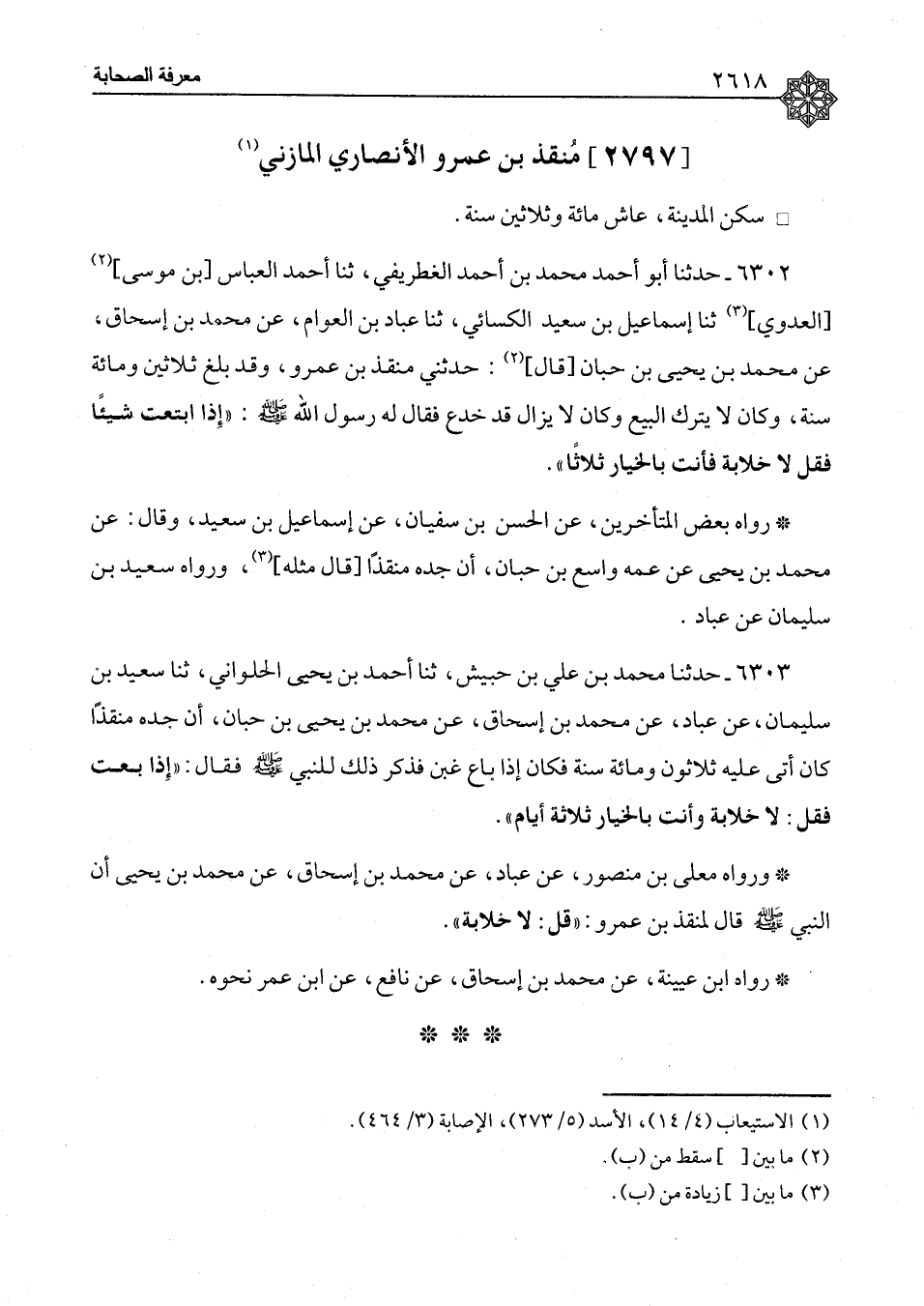 ٦٣٠٢ - حَدَّثَنَا أَبُو أَحْمَدَ مُحَمَّدُ بْنُ أَحْمَدَ الْغِطْرِيفِيُّ، ثنا أَحْمَدُ الْعَبَّاسُ بْنُ مُوسَى الْعَدَوِيُّ، ثنا إِسْمَاعِيلُ بْنُ سَعِيدٍ الْكِسَائِيُّ، ثنا عَبَّادُ بْنُ الْعَوَّامِ، عَنْ مُحَمَّدِ بْنِ إِسْحَاقَ، عَنْ مُحَمَّدِ بْنِ يَحْيَى بْنِ حَبَّانَ، قَالَ: حَدَّثَنِي مُنْقِذُ بْنُ عَمْرٍو، وَقَدْ بَلَغَ ثَلَاثِينَ وَمِائَةَ سَنَةٍ، وَكَانَ لَا يَتْرُكُ الْبَيْعَ , وَكَانَ لَا يَزَالُ قَدْ خُدِعَ، فَقَالَ لَهُ رَسُولُ اللهِ صَلَّى اللَّهُ عَلَيْهِ وَسَلَّمَ: " إِذَا ابْتَعْتَ شَيْئًا فَقُلْ: لَا خِلَابَةَ , فَأَنْتَ بِالْخِيَارِ ثَلَاثًا " رَوَاهُ بَعْضُ الْمُتَأَخِّرِينَ، عَنِ الْحَسَنِ بْنِ سُفْيَانَ، عَنْ إِسْمَاعِيلَ بْنِ سَعِيدٍ وَقَالَ: عَنْ مُحَمَّدِ بْنِ يَحْيَى، عَنْ عَمِّهِ وَاسِعِ بْنِ حَبَّانَ، أَنَّ جَدَّهُ مُنْقِذًا قَالَ مِثْلَهُ وَرَوَاهُ سَعِيدُ بْنُ سُلَيْمَانَ، عَنْ عَبَّادٍ