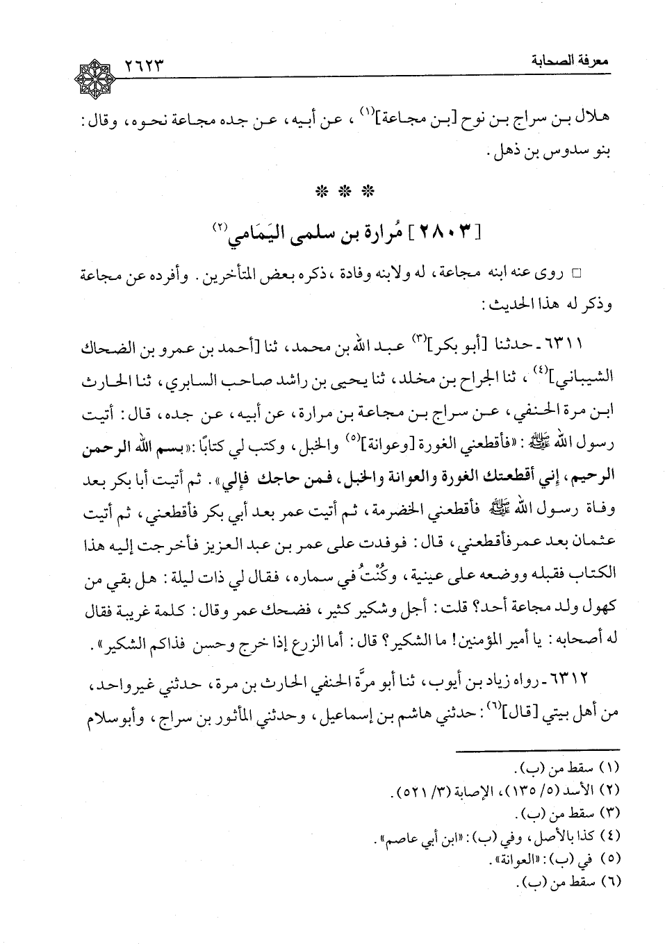٦٣١١ - حَدَّثَنَا أَبُو بَكْرٍ عَبْدُ اللهِ بْنُ مُحَمَّدٍ، ثنا أَحْمَدُ بْنُ عَمْرِو بْنِ الضَّحَّاكِ الشَّيْبَانِيُّ، ثنا الْجَرَّاحُ بْنُ مَخْلَدٍ، ثنا يَحْيَى بْنُ رَاشِدٍ صَاحِبُ السَّابِرِيِّ، ثنا الْحَارِثُ بْنُ مُرَّةَ الْحَنَفِيُّ، عَنْ سِرَاجِ بْنِ مُجَّاعَةَ بْنِ مُرَارَةَ، عَنْ أَبِيهِ، عَنْ جَدِّهِ، قَالَ: أَتَيْتُ رَسُولَ اللهِ صَلَّى اللَّهُ عَلَيْهِ وَسَلَّمَ , فَأَقْطَعَنِي الْغَوْرَةَ، وَعَوَانَةَ , وَالْخُبَلَ، وَكَتَبَ لِي كِتَابًا: بِسْمِ اللهِ الرَّحْمَنِ الرَّحِيمِ، إِنِّي أَقْطَعْتُكَ الْغَوْرَةَ وَالْعَوَانَةَ وَالْخُبَلَ، فَمَنْ حَاجَّكَ فَإِلَيَّ "، ثُمَّ أَتَيْتُ أَبَا بَكْرٍ بَعْدَ وَفَاةِ رَسُولِ اللهِ صَلَّى اللَّهُ عَلَيْهِ وَسَلَّمَ، فَأَقْطَعَنِي الْخِضْرِمَةَ، ثُمَّ أَتَيْتُ عُمَرَ بَعْدَ أَبِي بَكْرٍ فَأَقْطَعَنِي، ثُمَّ أَتَيْتُ عُثْمَانَ بَعْدَ عُمَرَ فَأَقْطَعَنِي , قَالَ: فَوَفَدْتُ عَلَى عُمَرَ بْنِ عَبْدِ الْعَزِيزِ , فَأَخْرَجْتُ إِلَيْهِ هَذَا الْكِتَابَ , فَقَبَّلَهُ وَوَضَعَهُ عَلَى عَيْنَيْهِ، وَكُنْتُ فِي سُمَّارِهِ، فَقَالَ لِي ذَاتَ لَيْلَةٍ: هَلْ بَقِيَ مِنْ كُهُولِ وَلَدِ مُجَّاعَةَ أَحَدٌ؟ قُلْتُ: أَجَلْ , وَشَكِيرٌ كَثِيرٌ، فَضَحِكَ عُمَرُ وَقَالَ: كَلِمَةٌ غَرِيبَةٌ، فَقَالَ لَهُ أَصْحَابُهُ: يَا أَمِيرَ الْمُؤْمِنِينَ مَا الشَّكِيرُ؟ قَالَ: أَمَا الزَّرْعُ إِذَا خَرَجَ وَحَسُنَ فَذَاكُمُ الشَّكِيرُ "