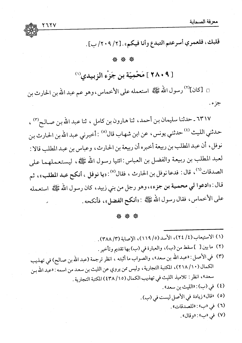 مَحْمِيَّةُ بْنُ جَزْءٍ الزُّبَيْدِيُّ كَانَ رَسُولُ اللهِ صَلَّى اللَّهُ عَلَيْهِ وَسَلَّمَ اسْتَعْمَلَهُ عَلَى الْأَخْمَاسِ، وَهُوَ عَمُّ عَبْدِ اللهِ بْنِ الْحَارِثِ بْنِ جَزْءٍ