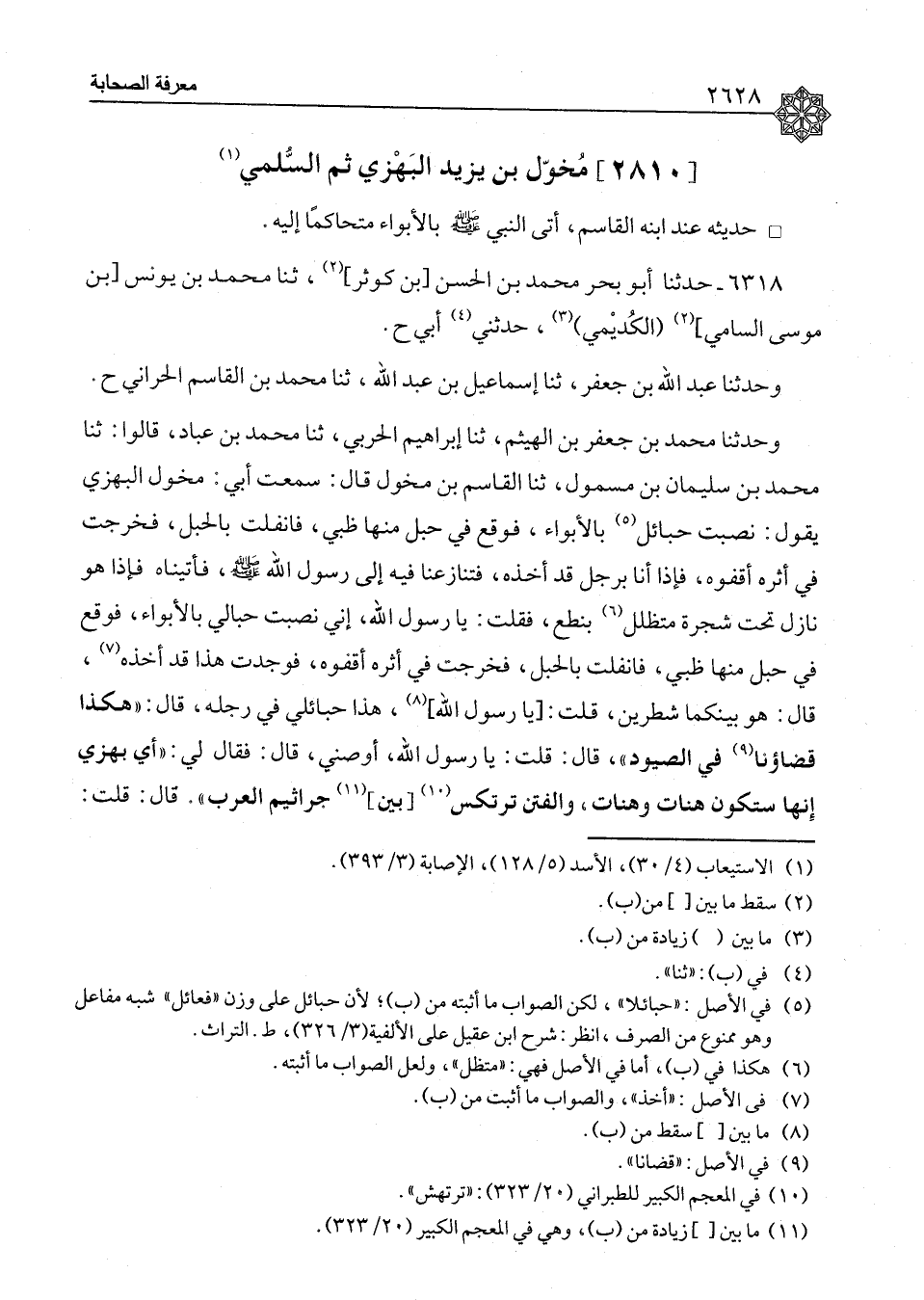٦٣١٨ - حَدَّثَنَا أَبُو بَحْرٍ مُحَمَّدُ بْنُ الْحَسَنِ بْنِ كَوْثَرٍ، ثنا مُحَمَّدُ بْنُ يُونُسَ بْنِ مُوسَى السَّامِيُّ الْكُدَيْمِيُّ، حَدَّثَنِي أَبِي ح، وَحَدَّثَنَا عَبْدُ اللهِ بْنُ جَعْفَرٍ، ثنا إِسْمَاعِيلُ بْنُ عَبْدِ اللهِ، ثنا مُحَمَّدُ بْنُ الْقَاسِمِ الْحَرَّانِيُّ، ح، وَحَدَّثَنَا مُحَمَّدُ بْنُ جَعْفَرِ بْنِ الْهَيْثَمِ، ثنا إِبْرَاهِيمُ الْحَرْبِيُّ، ثنا مُحَمَّدُ بْنُ عَبَّادٍ، قَالُوا: ثنا مُحَمَّدُ بْنُ سُلَيْمَانَ بْنِ مَسْمُولٍ، ثنا الْقَاسِمُ بْنُ مُخَوَّلٍ، قَالَ: سَمِعْتُ أَبِي مُخَوَّلًا الْبَهْزِيَّ يَقُولُ: " نَصَبْتُ حَبَائِلَ بِالْأَبْوَاءِ، فَوَقَعَ فِي حَبْلٍ مِنْهَا ظَبْيٌ، فَانْفَلَتَ بِالْحَبْلِ، فَخَرَجْتُ فِي أَثَرِهِ أَقْفُوهُ، فَإِذَا أَنَا بِرَجُلٍ قَدْ أَخَذَهُ، فَتَنَازَعْنَا فِيهِ إِلَى رَسُولِ اللهِ صَلَّى اللَّهُ عَلَيْهِ وَسَلَّمَ، فَأَتَيْنَاهُ فَإِذَا هُوَ نَازِلٌ تَحْتَ شَجَرَةٍ , مُتَظَلِّلٌ بِنِطَعٍ، فَقُلْتُ: يَا رَسُولَ اللهِ، إِنِّي نَصَبْتُ حِبَالِيَ بِالْأَبْوَاءِ، فَوَقَعَ فِي حَبْلٍ مِنْهَا ظَبْيٌ، فَانْفَلَتَ بِالْحَبْلِ، فَخَرَجْتُ فِي أَثَرِهِ أَقْفُوهُ، فَوَجَدْتُ هَذَا قَدْ أَخَذَهُ قَالَ: «هُوَ بَيْنَكُمَا شَطْرَيْنِ» ، قُلْتُ: يَا رَسُولَ اللهِ، هَذَا حَبَائِلِي فِي رِجْلِهِ قَالَ: «هَكَذَا قَضَاؤُنَا فِي الصُّيُودِ» قَالَ: قُلْتُ: يَا رَسُولَ اللهِ، أَوْصِنِي , قَالَ: فَقَالَ لِي: «أَيْ بَهْزِيُّ , إِنَّهَا سَتَكُونُ هَنَاتٌ وَهَنَاتٌ، وَالْفِتَنُ تَرْتَكِسُ بَيْنَ جَرَاثِيمِ الْعَرَبِ» قَالَ: قُلْتُ: ⦗٢٦٢٩⦘ يَا رَسُولَ اللهِ , الْإِبِلُ تَمُرُّ بِنَا، وَنَحْنُ مُضْعَفُونَ، وَهُنَّ حُفَّلٌ، فَقَالَ: " نَادِ: أَلَا يَا صَاحِبِ الْإِبِلِ فَإِنْ جَاءَ وَإِلَّا فَحْلُلْ صِرَارَهَا وَاشْرَبْ، وَبَقِّ فِي اللَّبَنِ دَوَاعِيَهُ " قَالَ: قُلْتُ: يَا رَسُولَ اللهِ، الرَّجُلُ أَمُرُّ بِهِ، وَإِنِّي عَطْشَانُ , فَأَسْتَسْقِيهِ، فَلَا يَسْقِيَنِي، فَيَمُرُّ بِي وَهُوَ عَطْشَانُ، أَفَأَسْقِيهِ، أَمْ أَجْزِيهِ بِمَا صَنَعَ؟ قَالَ: «لَا , وَلَكِنِ اسْقِهِ , فَإِنَّ لَكَ فِي كُلِّ ذَاتِ كَبِدٍ حَرَّى أَجْرًا» قَالَ: قُلْتُ: يَا رَسُولَ اللهِ، أَوْصِنِي , قَالَ: «أَيْ بَهْزِيُّ , أَطِعِ اللهَ، وَأَقِمِ الصَّلَاةَ، وآتِ الزَّكَاةَ، وَحُجَّ الْبَيْتَ، وَاعْتَمِرْ، وَبِرَّ وَالِدَيْكَ، وَصِلْ رَحِمَكَ، وَزُلْ مَعَ الْحَقِّ حَيْثُ مَازَالَ» لَفْظُ مُحَمَّدِ بْنِ يُونُسَ بْنِ مُوسَى الْكُدَيْمِيِّ، رَوَاهُ مُحَمَّدُ بْنُ عَبَّادٍ الْمَكِّيُّ، وَزَيْدُ بْنُ الْمُبَارَكِ الصَّنْعَانِيُّ، وَهُرَيْمُ بْنُ مِسْعَرٍ، عَنْ مُحَمَّدِ بْنِ سُلَيْمَانَ بْنِ مَسْمُولٍ نَحْوَهُ