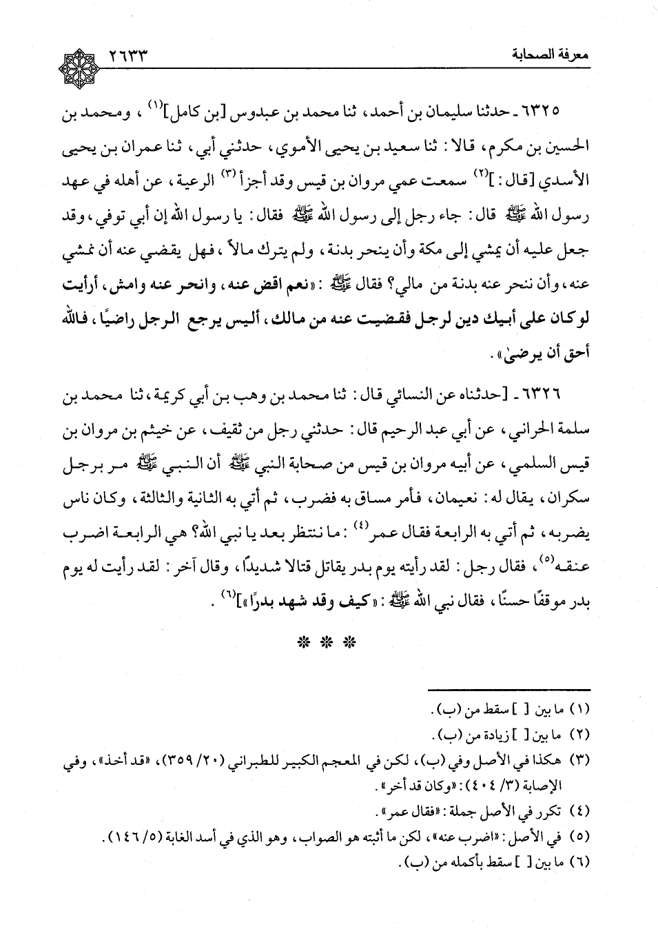 ٦٣٢٦ - حُدِّثْنَاهُ عَنِ النَّسَائِيِّ، قَالَ: ثنا مُحَمَّدُ بْنُ وَهْبِ بْنِ أَبِي كَرِيمَةَ، ثنا مُحَمَّدُ بْنُ سَلَمَةَ الْحَرَّانِيُّ، عَنْ أَبِي عَبْدِ الرَّحِيمِ، قَالَ: حَدَّثَنِي رَجُلٌ مِنْ ثَقِيفٍ، عَنْ خَيْثَمِ بْنِ مَرْوَانَ بْنِ قَيْسٍ السُّلَمِيِّ، عَنْ أَبِيهِ مَرْوَانَ بْنِ قَيْسٍ مِنْ صَحَابَةِ النَّبِيِّ صَلَّى اللَّهُ عَلَيْهِ وَسَلَّمَ: " أَنَّ النَّبِيَّ صَلَّى اللَّهُ عَلَيْهِ وَسَلَّمَ مَرَّ بِرَجُلٍ سَكْرَانَ، يُقَالُ لَهُ: نُعَيْمَانُ، فَأَمَرَ مُسَاقٍ بِهِ فَضُرِبَ، ثُمَّ أُتِيَ بِهِ الثَّانِيَةَ وَالثَّالِثَةَ، وَكَانَ نَاسٌ يَضْرِبُونَهُ، ثُمَّ أُتِيَ بِهِ الرَّابِعَةَ، فَقَالَ عُمَرُ: مَا نَنْتَظِرُ بَعْدُ يَا نَبِيَّ اللهِ؟ هِيَ الرَّابِعَةُ , اضْرِبْ عُنُقَهُ، فَقَالَ رَجُلٌ: لَقَدْ رَأَيْتُهُ يَوْمَ بَدْرٍ يُقَاتِلُ قِتَالًا شَدِيدًا، وَقَالَ آخَرُ: لَقَدْ رَأَيْتُ لَهُ يَوْمَ بَدْرٍ مَوْقِفًا حَسَنًا، فَقَالَ نَبِيُّ اللهِ صَلَّى اللَّهُ عَلَيْهِ وَسَلَّمَ: «كَيْفَ وَقَدْ شَهِدَ بَدْرًا؟»