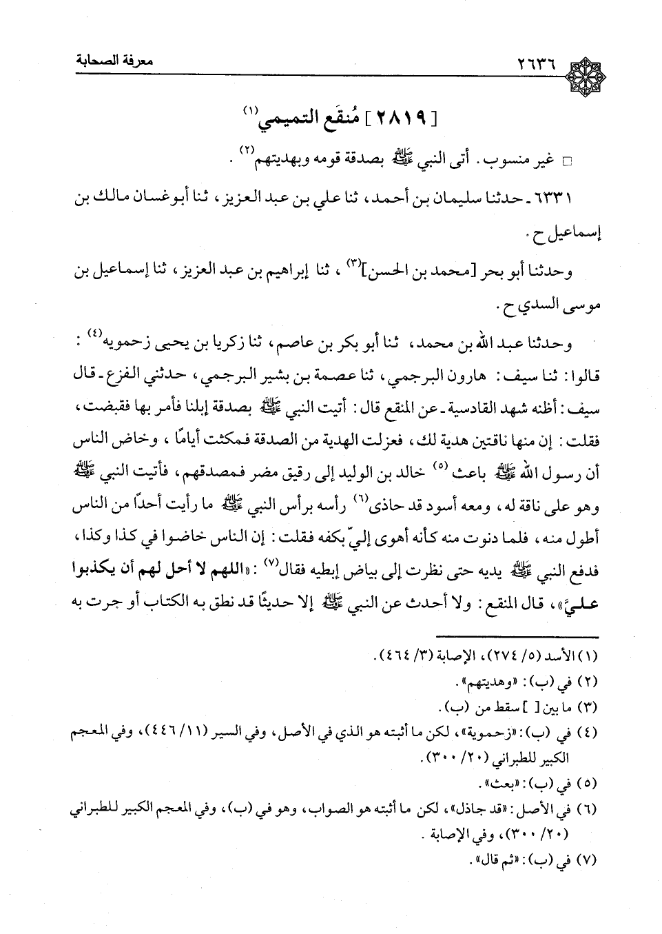 ٦٣٣١ - حَدَّثَنَا سُلَيْمَانُ بْنُ أَحْمَدَ، ثنا عَلِيُّ بْنُ عَبْدِ الْعَزِيزِ، ثنا أَبُو غَسَّانَ مَالِكُ بْنُ إِسْمَاعِيلَ ح، وَحَدَّثَنَا أَبُو بَحْرٍ مُحَمَّدُ بْنُ الْحَسَنِ، ثنا إِبْرَاهِيمُ بْنُ عَبْدِ الْعَزِيزِ، ثنا أَبُو غَسَّانَ مَالِكُ بْنُ إِسْمَاعِيلَ ح، وَحَدَّثَنَا أَبُو بَحْرٍ مُحَمَّدُ بْنُ الْحَسَنِ، ثنا إِبْرَاهِيمُ بْنُ عَبْدِ الْعَزِيزِ، ثنا إِسْمَاعِيلُ بْنُ مُوسَى السُّدِّيُّ، ح، وَحَدَّثَنَا عَبْدُ اللهِ بْنُ مُحَمَّدٍ، ثنا أَبُو بَكْرِ بْنُ عَاصِمٍ، ثنا زَكَرِيَّا بْنُ يَحْيَى زَحْمَوَيْهِ: قَالُوا: ثنا سَيْفٌ هَارُونُ الْبُرْجُمِيُّ، ثنا عِصْمَةُ بْنُ بَشِيرٍ الْبُرْجُمِيُّ، حَدَّثَنِي الْفَزَعُ، - قَالَ سَيْفٌ: أَظُنُّهُ شَهِدَ الْقَادِسِيَّةَ عَنِ الْمُنْقَعِ، قَالَ: " أَتَيْتُ النَّبِيَّ صَلَّى اللَّهُ عَلَيْهِ وَسَلَّمَ بِصَدَقَةِ إِبِلِنَا , فَأَمَرَ بِهَا فَقُبِضَتْ، فَقُلْتُ: إِنَّ مِنْهَا نَاقَتَيْنِ هَدِيَّةٌ لَكَ، فَعُزِلَتِ الْهَدِيَّةُ مِنَ الصَّدَقَةِ , فَمَكَثْتُ أَيَّامًا، وَخَاضَ النَّاسُ أَنَّ رَسُولَ اللهِ صَلَّى اللَّهُ عَلَيْهِ وَسَلَّمَ بَاعِثٌ خَالِدَ بْنَ الْوَلِيدِ إِلَى رَقِيقِ مُضَرَ فَمُصْدِقُهُمْ، فَأَتَيْتُ النَّبِيَّ صَلَّى اللَّهُ عَلَيْهِ وَسَلَّمَ وَهُوَ عَلَى نَاقَةٍ لَهُ، وَمَعَهُ أَسْوَدُ قَدْ حَاذَى رَأْسَهُ بِرَأْسِ النَّبِيِّ صَلَّى اللَّهُ عَلَيْهِ وَسَلَّمَ , مَا رَأَيْتُ أَحَدًا مِنَ النَّاسِ أَطْوَلَ مِنْهُ، فَلَمَّا دَنَوْتُ مِنْهُ كَأَنَّهُ أَهْوَى إِلَيَّ بِكَفِّهِ , فَقُلْتُ: إِنَّ النَّاسَ خَاضُوا فِي كَذَا وَكَذَا، فَدَفَعَ النَّبِيُّ صَلَّى اللَّهُ عَلَيْهِ وَسَلَّمَ يَدَيْهِ حَتَّى نَظَرْتُ إِلَى بَيَاضِ إِبْطَيْهِ , فَقَالَ: «اللهُمَّ لَا أُحِلُّ لَهُمْ أَنْ يَكْذِبُوا عَلَيَّ» قَالَ الْمُنْقَعُ: وَلَا أُحَدِّثُ عَنِ النَّبِيِّ صَلَّى اللَّهُ عَلَيْهِ وَسَلَّمَ إِلَّا حَدِيثًا قَدْ نَطَقَ بِهِ الْكِتَابُ أَوْ جَرَتْ بِهِ ⦗٢٦٣٧⦘ سُنَّةٌ، يُكْذَبُ عَلَيْهِ فِي حَيَاتِهِ , فَكَيْفَ بَعْدَ مَوْتِهِ لَفْظُ أَبِي غَسَّانَ
