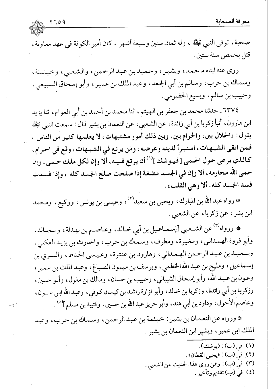 ٦٣٧٤ - حَدَّثَنَا مُحَمَّدُ بْنُ جَعْفَرِ بْنِ الْهَيْثَمِ، ثنا مُحَمَّدُ بْنُ أَحْمَدَ بْنِ أَبِي الْعَوَّامِ، ثنا يَزِيدُ بْنُ هَارُونَ، أَنْبَأَ زَكَرِيَّا بْنُ أَبِي زَائِدَةَ، عَنِ الشَّعْبِيِّ، عَنِ النُّعْمَانِ بْنِ بَشِيرٍ، قَالَ: سَمِعْتُ النَّبِيَّ صَلَّى اللَّهُ عَلَيْهِ وَسَلَّمَ يَقُولُ: «الْحَلَالُ بَيِّنٌ، وَالْحَرَامُ بَيِّنٌ، وَبَيْنَ ذَلِكَ أُمُورٌ مُشْتَبِهَاتٌ، لَا يَعْلَمُهَا كَثِيرٌ مِنَ النَّاسِ، فَمَنِ اتَّقَى الشُّبُهَاتِ، اسْتَبْرَأَ لِدِينِهِ وَعِرْضِهِ، وَمَنْ يَرْتَعُ فِي الشُّبُهَاتِ، وَقَعَ فِي الْحَرَامِ، كَالَّذِي يَرْعَى حَوْلَ الْحِمَى , فَيُوشِكُ أَنْ يَرْتَعَ فِيهِ، أَلَا وَإِنَّ لِكُلِّ مَلِكٍ حِمًى، وَإِنَّ حِمَى اللهِ مَحَارِمُهُ، أَلَا وَإِنَّ فِي الْجَسَدِ مُضْغَةً , إِذَا صَلُحَتْ صَلُحَ الْجَسَدُ كُلُّهُ، وَإِذَا فَسَدَتْ فَسَدَ الْجَسَدُ كُلُّهُ، أَلَا وَهِيَ الْقَلْبُ» رَوَاهُ عَبْدُ اللهِ بْنُ الْمُبَارَكِ، وَيَحْيَى بْنُ سَعِيدٍ، وَعِيسَى بْنُ يُونُسَ، وَوَكِيعٌ، وَمُحَمَّدُ بْنُ بِشْرٍ، عَنْ زَكَرِيَّا، عَنِ الشَّعْبِيِّ. وَرَوَاهُ عَنِ الشَّعْبِيِّ إِسْمَاعِيلُ بْنُ أَبِي خَالِدٍ، وَعَاصِمُ بْنُ بَهْدَلَةَ، وَمُجَالِدٌ، وَأَبُو فَرْوَةَ الْهَمْدَانِيُّ، وَمُغِيرَةُ، وَمُطَرِّفٌ، وَسِمَاكُ بْنُ حَرْبٍ، وَالْحَارِثُ بْنُ يَزِيدَ الْعُكْلِيُّ، وَسَعِيدُ بْنُ عَبْدِ الرَّحْمَنِ الْهَمْدَانِيُّ، وَهَارُونُ بْنُ عَنْتَرَةَ، وَعِيسَى الْحَنَّاطُ، وَالسَّرِيُّ بْنُ إِسْمَاعِيلَ، وَمَلِيحُ بْنُ عَبْدِ اللهِ الْخَطْمِيُّ، وَيُوسُفُ بْنُ مَيْمُونٍ الصَّبَّاغُ، وَعَبْدُ الْمَلِكِ بْنُ عُمَيْرٍ، وَعَوْنُ بْنُ عَبْدِ اللهِ، وَأَبُو إِسْحَاقَ الشَّيْبَانِيُّ، وَحَبِيبُ بْنُ حَسَّانَ، وَمَالِكُ بْنُ مِغْوَلٍ، وَأَبُو حُسَيْنٍ، وَزَكَرِيَّا بْنُ أَبِي زَائِدَةَ، وَزَكَرِيَّا بْنُ خَالِدٍ، وَأَبُو فَزَارَةَ رَاشِدُ بْنُ كَيْسَانَ كُوفِيُّ، وَعَبْدُ اللهِ بْنُ عَوْنٍ، وَعَاصِمٌ الْأَحْوَلُ، وَدَاوُدُ بْنُ أَبِي هِنْدٍ، وَأَبُو حَرِيزٍ عَبْدُ اللهِ بْنُ حُسَيْنٍ، وَقُتَيْبَةُ بْنُ مُسْلِمٍ، وَرَوَاهُ عَنِ النُّعْمَانِ بْنِ بَشِيرٍ: خَيْثَمَةُ بْنُ عَبْدِ الرَّحْمَنِ، وَسِمَاكُ بْنُ حَرْبٍ، وَعَبْدُ الْمَلِكِ بْنُ عُمَيْرٍ، وَبَشِيرُ بْنُ النُّعْمَانِ بْنِ بَشِيرٍ