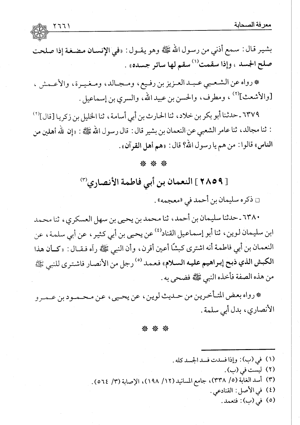 ٦٣٧٩ - حَدَّثَنَا أَبُو بَكْرِ بْنُ خَلَّادٍ، ثنا الْحَارِثُ بْنُ أَبِي أُسَامَةَ، ثنا الْخَلِيلُ بْنُ زَكَرِيَّا، قَالَ: ثنا مُجَالِدٌ، ثنا عَامِرٌ الشَّعْبِيُّ، عَنِ النُّعْمَانِ بْنِ بَشِيرٍ، قَالَ: قَالَ رَسُولُ اللهِ صَلَّى اللَّهُ عَلَيْهِ وَسَلَّمَ: «إِنَّ لِلَّهِ أَهْلِينَ مِنَ النَّاسِ» ، قَالُوا: مَنْ هُمْ يَا رَسُولَ اللهِ؟ قَالَ: «هُمْ أَهْلُ الْقُرْآنِ»