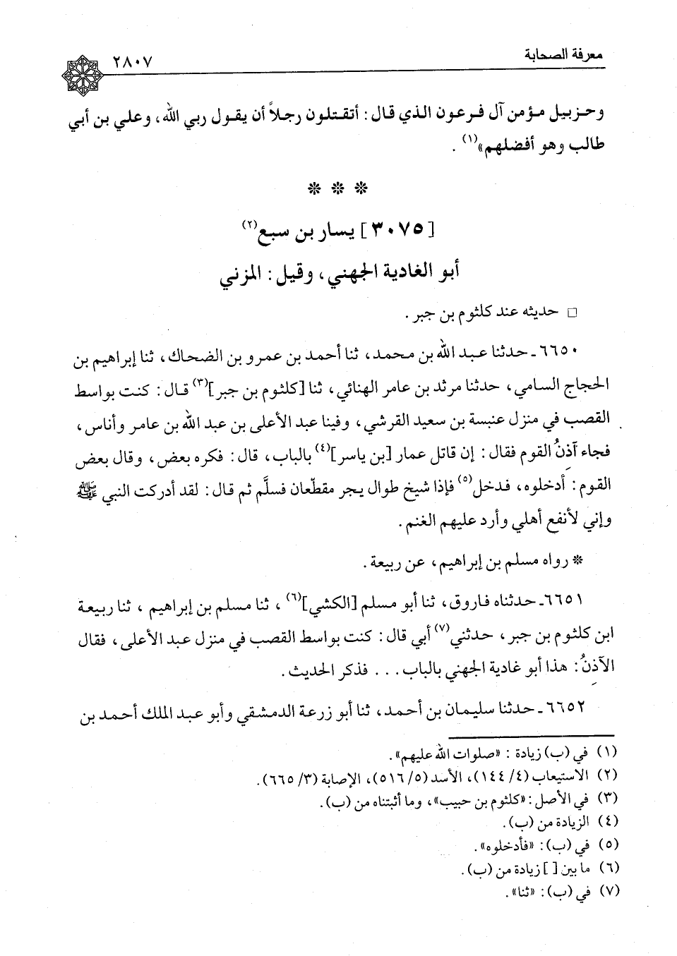 ٦٦٥٠ - حَدَّثَنَا عَبْدُ اللهِ بْنُ مُحَمَّدٍ، ثنا أَحْمَدُ بْنُ عَمْرِو بْنِ الضَّحَّاكِ، ثنا إِبْرَاهِيمُ بْنُ الْحَجَّاجِ السَّامِيُّ، حَدَّثَنَا مَرْثَدُ بْنُ عَامِرٍ الْهُنَائِيُّ، ثنا كُلْثُومُ بْنُ جَبْرٍ، قَالَ: " كُنْتُ بِوَاسِطَ الْقَصَبِ فِي مَنْزِلِ عَنْبَسَةَ بْنِ سَعِيدٍ الْقُرَشِيِّ، وَفِينَا عَبْدُ الْأَعْلَى بْنُ عَبْدِ اللهِ بْنِ عَامِرٍ , وَأُنَاسٌ، فَجَاءَ آذِنُ الْقَوْمِ فَقَالَ: إِنَّ قَاتِلَ عَمَّارِ بْنِ يَاسِرٍ بِالْبَابِ , قَالَ: فَكَرِهَ بَعْضٌ، وَقَالَ بَعْضُ الْقَوْمِ: أَدْخِلُوهُ، فَدَخَلَ , فَإِذَا شَيْخٌ طُوَالٌ , يَجُرُّ مُقَطَّعَانِ , فَسَلَّمَ ثُمَّ قَالَ: لَقَدْ أَدْرَكْتُ النَّبِيَّ صَلَّى اللَّهُ عَلَيْهِ وَسَلَّمَ , وَإِنِّي لَأَنْفَعُ أَهْلِي , وَأَرُدُّ عَلَيْهِمُ الْغَنَمَ " رَوَاهُ مُسْلِمُ بْنُ إِبْرَاهِيمَ، عَنْ رَبِيعَةَ