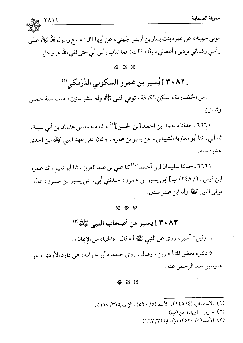 ٦٦٦٠ - حَدَّثَنَا مُحَمَّدُ بْنُ أَحْمَدَ بْنِ الْحَسَنِ، ثنا مُحَمَّدُ بْنُ عُثْمَانَ بْنِ أَبِي شَيْبَةَ، ثنا أَبِي، ثنا أَبُو مُعَاوِيَةَ الشَّيْبَانِيُّ، عَنْ يَسِيرِ بْنِ عَمْرٍو: «وَكَانَ عَلَى عَهْدِ النَّبِيِّ صَلَّى اللَّهُ عَلَيْهِ وَسَلَّمَ ابْنَ إِحْدَى عَشْرَةَ سَنَةً»