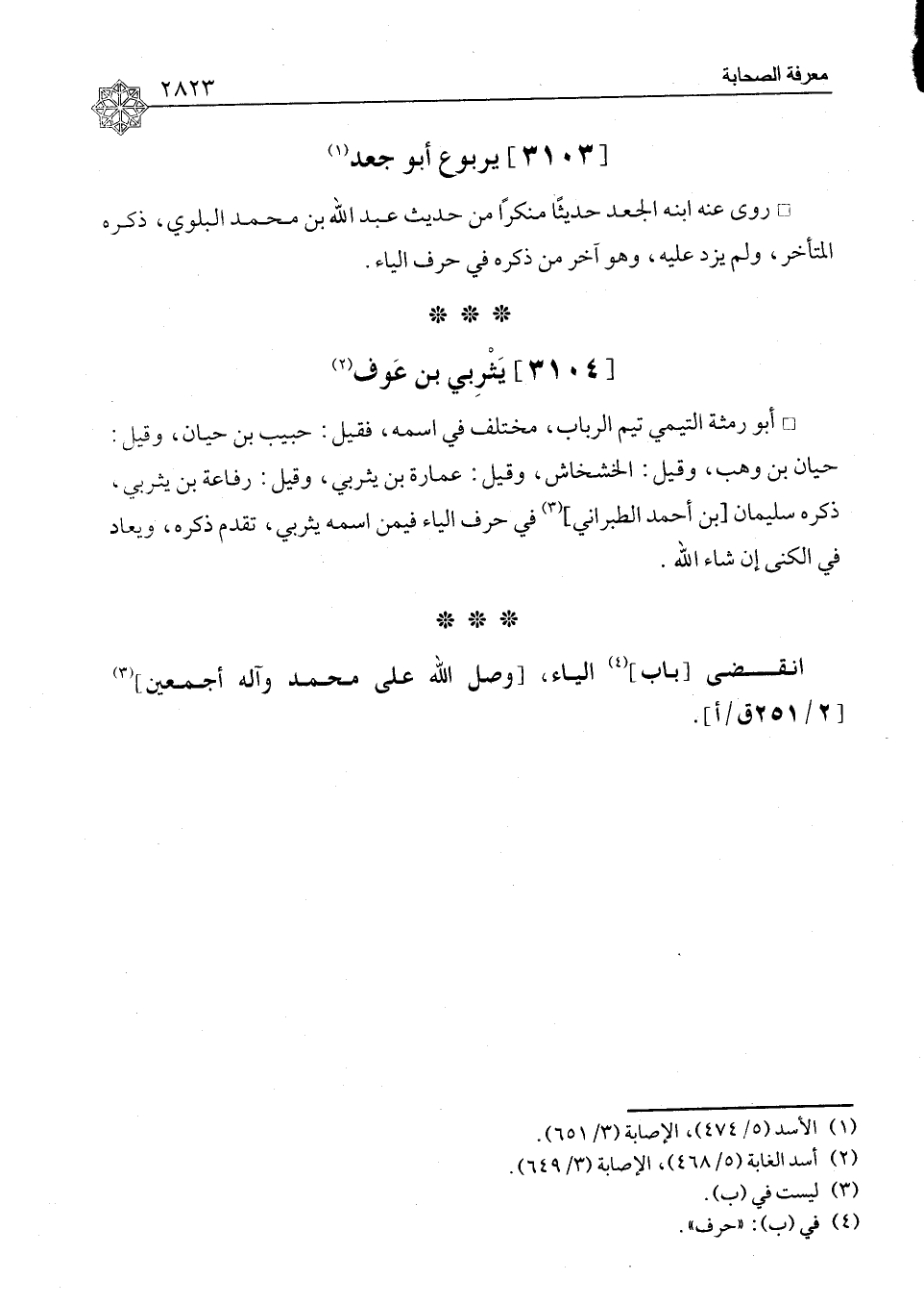 يَرْبُوعٌ أَبُو جَعْدٍ رَوَى عَنْهُ ابْنُهُ الْجَعْدُ حَدِيثًا مُنْكَرًا مِنْ حَدِيثِ عَبْدِ اللهِ بْنِ مُحَمَّدٍ الْبَلَوِيِّ، ذَكَرَهُ الْمُتَأَخِّرُ، وَلَمْ يَزِدْ عَلَيْهِ، وَهُوَ آخِرُ مَنْ ذَكَرَهُ فِي حَرْفِ الْيَاءِ