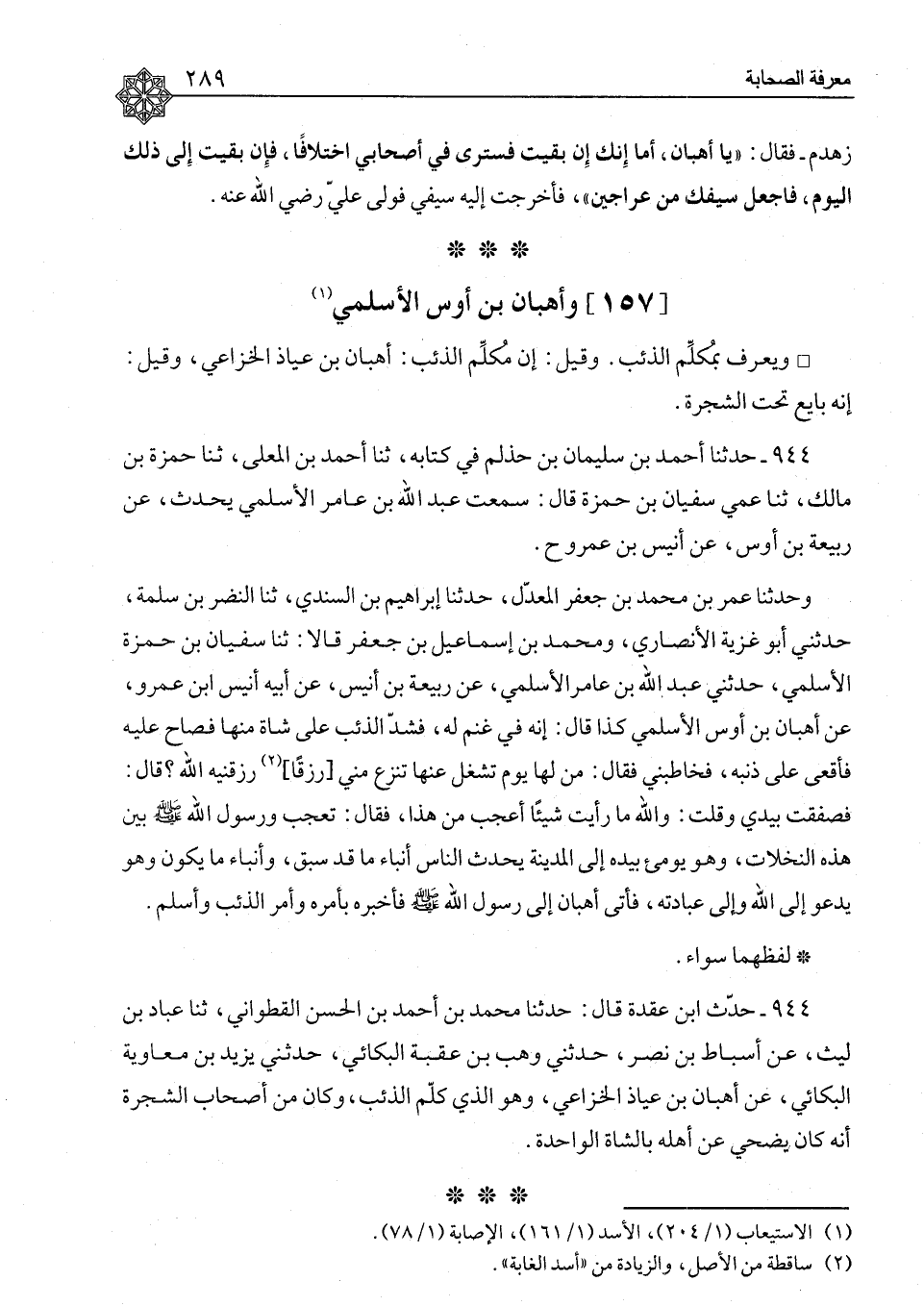 ٩٤٤ - حَدَّثَنَا أَحْمَدُ بْنُ سُلَيْمَانَ بْنِ حَذْلَمٍ، فِي كِتَابِهِ، ثنا أَحْمَدُ بْنُ الْمُعَلَّى، ثنا حَمْزَةُ بْنُ مَالِكٍ، ثنا عَمِّي، سُفْيَانُ بْنُ حَمْزَةَ، قَالَ: سَمِعْتُ عَبْدَ اللهِ بْنَ عَامِرٍ الْأَسْلَمِيَّ، يُحَدِّثُ، عَنْ رَبِيعَةَ بْنِ أُوْسٍ، عَنْ أُنَيْسِ بْنِ عَمْرٍو ح وَحَدَّثَنَا عُمَرُ بْنُ مُحَمَّدِ بْنِ جَعْفَرٍ الْمُعَدِّلُ، حَدَّثَنَا إِبْرَاهِيمُ بْنُ السِّنْدِيِّ، ثنا النَّضْرُ بْنُ سَلَمَةَ، حَدَّثَنِي أَبُو غَزِيَّةَ الْأَنْصَارِيُّ، وَمُحَمَّدُ بْنُ إِسْمَاعِيلَ بْنِ جَعْفَرٍ، قَالَا: ثنا سُفْيَانُ بْنُ حَمْزَةَ الْأَسْلَمِيُّ، حَدَّثَنِي عَبْدُ اللهِ بْنُ عَامِرٍ الْأَسْلَمِيُّ، عَنْ رَبِيعَةَ بْنِ أُنَيْسٍ، عَنْ أَبِيهِ، أُنَيْسِ بْنِ عَمْرٍو، عَنْ أُهْبَانَ بْنِ أَوْسٍ الْأَسْلَمِيِّ، كَذَا قَالَ: " إِنَّهُ فِي غَنَمٍ لَهُ فَشَدَّ الذِّئْبُ عَلَى شَاةٍ مِنْهَا، فَصَاحَ عَلَيْهِ فَأَقْعَى عَلَى ذَنَبِهِ، فَخَاطَبَنِي فَقَالَ: مَنْ لَهَا يَوْمَ تُشْغَلُ عَنْهَا، تَنْزِعُ مِنِّي رِزْقًا رَزَقْنِيهِ اللهُ؟ قَالَ: فَصَفَقْتُ بِيَدِي، وَقُلْتُ: وَاللهِ مَا رَأَيْتُ شَيْئًا أَعْجَبَ مِنْ هَذَا، فَقَالَ: تَعْجَبُ وَرَسُولُ اللهِ صَلَّى اللَّهُ عَلَيْهِ وَسَلَّمَ بَيْنَ هَذِهِ النَّخْلَاتِ، وَهُوَ يُومِئُ بِيَدِهِ إِلَى الْمَدِينَةِ، يُحَدِّثُ النَّاسَ أَنْبَاءَ مَا قَدْ سَبَقَ، وَأَنْبَاءَ مَا يَكُونُ، وَهُوَ يَدْعُو إِلَى اللهِ وَإِلَى عِبَادَتِهِ، فَأَتَى أُهْبَانُ إِلَى رَسُولِ اللهِ صَلَّى اللَّهُ عَلَيْهِ وَسَلَّمَ فَأَخْبَرَهُ بِأَمْرِهِ وَأَمْرِ الذِّئْبِ وَأَسْلَمَ، لَفْظُهُمَا سَوَاءٌ "