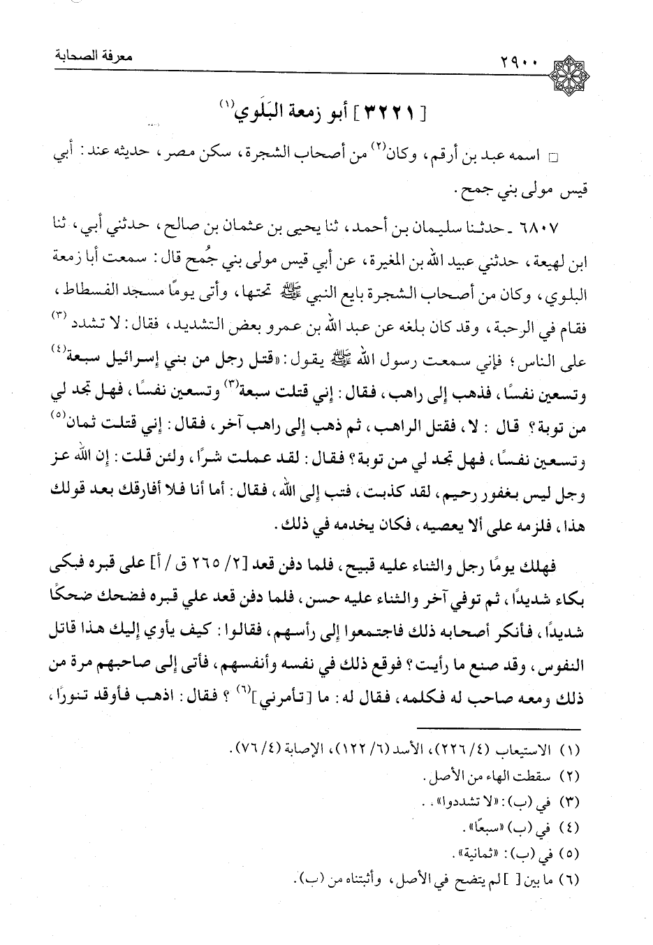 ٦٨٠٧ - حَدَّثَنَا سُلَيْمَانُ بْنُ أَحْمَدَ، ثنا يَحْيَى بْنُ عُثْمَانَ بْنِ صَالِحٍ، حَدَّثَنِي أَبِي، ثنا ابْنُ لَهِيعَةَ، حَدَّثَنِي عُبَيْدُ اللهِ بْنُ الْمُغِيرَةِ، عَنْ أَبِي قَيْسٍ، مَوْلَى بَنِي جُمَحٍ , قَالَ: سَمِعْتُ أَبَا زَمْعَةَ الْبَلَوِيَّ، وَكَانَ، مِنْ أَصْحَابِ الشَّجَرَةِ , بَايَعَ النَّبِيَّ صَلَّى اللَّهُ عَلَيْهِ وَسَلَّمَ تَحْتَهَا، وَأَتَى يَوْمًا مَسْجِدَ الْفُسْطَاطِ، فَقَامَ فِي الرَّحَبَةِ، وَقَدْ كَانَ بَلَغَهُ عَنْ عَبْدِ اللهِ بْنِ عَمْرٍو بَعْضُ التَّشْدِيدِ، فَقَالَ: " لَا تُشَدِّدْ عَلَى النَّاسِ، فَإِنِّي سَمِعْتُ رَسُولَ اللهِ صَلَّى اللَّهُ عَلَيْهِ وَسَلَّمَ يَقُولُ: " قَتَلَ رَجُلٌ مِنْ بَنِي إِسْرَائِيلَ سَبْعَةً وَتِسْعِينَ نَفْسًا، فَذَهَبَ إِلَى رَاهِبٍ، فَقَالَ: إِنِّي قَتَلْتُ سَبْعَةً وَتِسْعِينَ نَفْسًا، فَهَلْ تَجِدُ لِي مِنْ تَوْبَةٍ؟ قَالَ: لَا، فَقَتَلَ الرَّاهِبَ، ثُمَّ ذَهَبَ إِلَى رَاهِبٍ آخَرَ، فَقَالَ: إِنِّي قَتَلْتُ ثَمَانِيَ وَتِسْعِينَ نَفْسًا، فَهَلْ تَجِدُ لِي مِنْ تَوْبَةٍ؟ فَقَالَ: لَقَدْ عَمِلْتَ شَرًّا، وَلَئِنْ قُلْتُ: إِنَّ اللهَ عَزَّ وَجَلَّ لَيْسَ بِغَفُورٍ رَحِيمٍ، لَقَدْ كَذَبْتُ، فَتُبْ إِلَى اللهِ، فَقَالَ: أَمَّا أَنَا فَلَا أُفَارِقُكَ بَعْدَ قَوْلِكَ هَذَا، فَلَزِمَهُ عَلَى أَلَّا يَعْصِيَهُ، فَكَانَ يَخْدُمُهُ فِي ذَلِكَ، فَهَلَكَ يَوْمًا رَجُلٌ , وَالثَّنَاءُ عَلَيْهِ قَبِيحٌ، فَلَمَّا دُفِنَ قَعَدَ عَلَى قَبْرِهِ فَبَكَى بُكَاءً شَدِيدًا، ثُمَّ تُوُفِّيَ آخَرُ وَالثَّنَاءُ عَلَيْهِ حَسَنٌ، فَلَمَّا دُفِنَ قَعَدَ عَلَى قَبْرِهِ فَضَحِكَ ضَحِكًا شَدِيدًا، فَأَنْكَرَ أَصْحَابُهُ ذَلِكَ , فَاجْتَمَعُوا إِلَى رَأْسِهِمْ، فَقَالُوا: كَيْفَ يَأْوِي إِلَيْكَ هَذَا قَاتِلُ النُّفُوسِ، وَقَدْ صَنَعَ مَا رَأَيْتَ؟ فَوَقَعَ ذَلِكَ فِي نَفْسِهِ وَأَنْفُسِهِمْ، فَأَتَى إِلَى صَاحِبِهِمْ مَرَّةً مِنْ ذَلِكَ , وَمَعَهُ صَاحِبٌ لَهُ , فَكَلَّمَهُ، فَقَالَ لَهُ: مَا تَأْمُرُنِي؟ فَقَالَ: اذْهَبْ فَأَوْقِدْ تَنُّورًا، ⦗٢٩٠٢⦘ فَفَعَلَ , ثُمَّ أَتَاهُ يُخْبِرُهُ أَنْ قَدْ فَعَلَ، فَقَالَ: اذْهَبْ فَأَلْقِ نَفْسَكَ فِيهَا، فَلَهِيَ عَنْهُ الرَّاهِبُ، وَذَهَبَ الْآخَرُ، فَأَلْقَى نَفْسَهُ فِي التَّنُّورِ، ثُمَّ اسْتَفَاقَ الرَّاهِبُ، فَقَالَ: إِنِّي لَأَظُنُّ الرَّجُلَ قَدْ أَلْقَى نَفْسَهُ فِي التَّنُّورِ لِقَوْلِي لَهُ، فَذَهَبَ إِلَيْهِ , فَوَجَدَهُ حَيًّا فِي التَّنُّورِ يَعْرَقُ، فَأَخَذَ بِيَدِهِ , فَأَخْرَجَهُ مِنَ التَّنُّورِ، فَقَالَ: مَا يَنْبَغِي لَكَ أَنْ تَخْدُمُنِي , وَلَكِنْ أَنَا أَخْدُمُكُ، أَخْبِرْنِي عَنْ بُكَائِكَ عَلَى الْمُتَوَفَّى الْأَوَّلِ , وَعَنْ ضَحِكِكَ عَلَى الْآخَرِ؟ قَالَ: أَمَّا الْأَوَّلُ: فَإِنَّهُ لَمَّا دُفِنَ , رَأَيْتُ مَا يَلْقَى بِهِ مِنَ الشَّرِّ، فَذَكَرْتُ ذُنُوبِي فَبَكَيْتُ، وَأَمَّا الْآخَرُ: فَإِنِّي رَأَيْتُ مَا يَلْقَى بِهِ مِنَ الْخَيْرِ , فَضَحِكْتُ، فَكَانَ بَعْدَ ذَلِكَ مِنْ عُظَمَاءِ بَنِي إِسْرَائِيلَ "