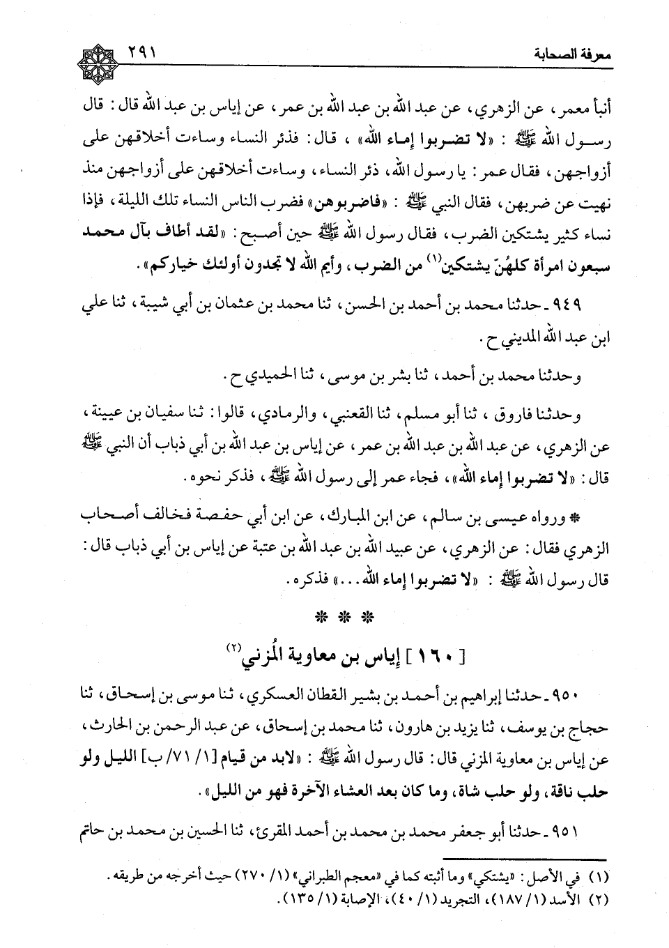 ٩٤٩ - حَدَّثَنَا مُحَمَّدُ بْنُ أَحْمَدَ بْنِ الْحَسَنِ، ثنا مُحَمَّدُ بْنُ عُثْمَانَ بْنِ أَبِي شَيْبَةَ، ثنا عَلِيُّ بْنُ عَبْدِ اللهِ الْمَدِينِيُّ ح وَحَدَّثَنَا مُحَمَّدُ بْنُ أَحْمَدَ، ثنا بِشْرُ بْنُ مُوسَى، ثنا الْحُمَيْدِيُّ ح وَحَدَّثَنَا فَارُوقٌ، ثنا أَبُو مُسْلِمٍ، ثنا الْقَعْنَبِيُّ، وَالرَّمَادِيُّ، قَالُوا: ثنا سُفْيَانُ بْنُ عُيَيْنَةَ، عَنِ الزُّهْرِيِّ، عَنْ عَبْدِ اللهِ بْنِ عَبْدِ اللهِ بْنِ عُمَرَ، عَنْ إِيَاسَ بْنِ عَبْدِ اللهِ بْنِ أَبِي ذُبَابٍ، أَنَّ النَّبِيَّ صَلَّى اللَّهُ عَلَيْهِ وَسَلَّمَ قَالَ: «لَا تَضْرِبُوا إِمَاءَ اللهِ» فَجَاءَ عُمَرُ إِلَى رَسُولِ اللهِ صَلَّى اللَّهُ عَلَيْهِ وَسَلَّمَ فَذَكَرَ نَحْوَهُ، وَرَوَاهُ عِيسَى بْنُ سَالِمٍ، عَنِ ابْنِ الْمُبَارَكِ، عَنِ ابْنِ أَبِي حَفْصَةَ، فَخَالَفَ أَصْحَابَ الزُّهْرِيِّ، فَقَالَ: عَنِ الزُّهْرِيِّ، عَنْ عُبَيْدِ اللهِ بْنِ عَبْدِ اللهِ بْنِ عُتْبَةَ، عَنْ إِيَاسَ بْنِ أَبِي ذُبَابٍ، قَالَ: قَالَ رَسُولُ اللهِ صَلَّى اللَّهُ عَلَيْهِ وَسَلَّمَ: «لَا تَضْرِبُوا إِمَاءَ اللهِ» فَذَكَرَهُ "