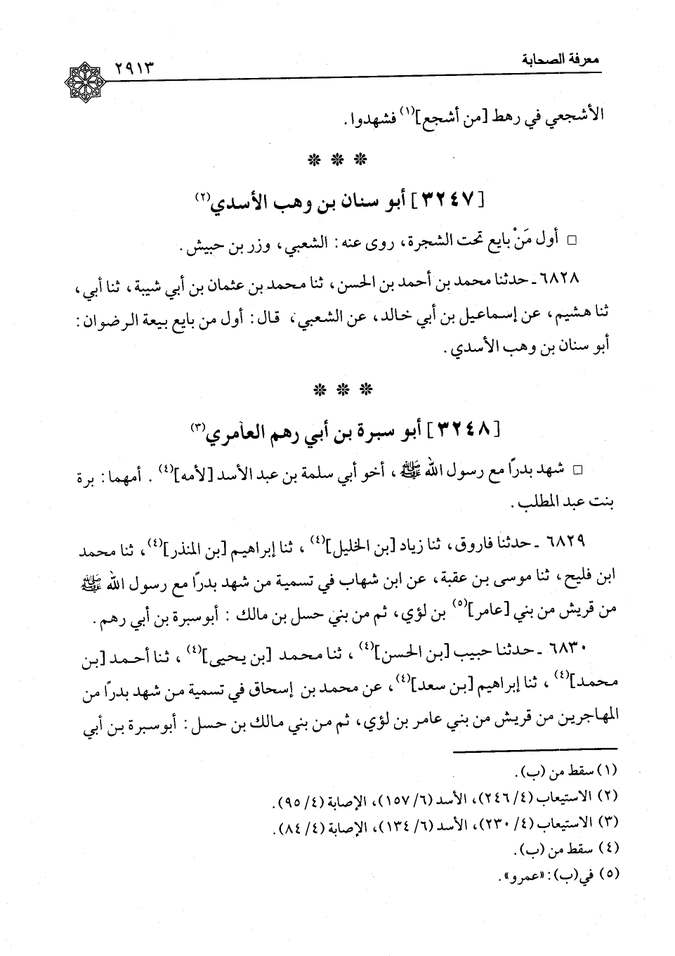 ٦٨٣٠ - حَدَّثَنَا حَبِيبُ بْنُ الْحَسَنِ، ثنا مُحَمَّدُ بْنُ يَحْيَى، ثنا أَحْمَدُ بْنُ مُحَمَّدٍ، ثنا إِبْرَاهِيمُ بْنُ سَعْدٍ، عَنْ مُحَمَّدِ بْنِ إِسْحَاقَ: " فِي تَسْمِيَةِ مَنْ شَهِدَ بَدْرًا مِنَ الْمُهَاجِرِينَ مِنْ قُرَيْشٍ مِنْ بَنِي عَامِرِ بْنِ لُؤَيٍّ، ثُمَّ مِنْ بَنِي مَالِكِ بْنِ حَسَلٍ: أَبُو سَبْرَةَ بْنُ أَبِي ⦗٢٩١٤⦘ رُهْمِ بْنِ عَبْدِ الْعُزَّى بْنِ أَبِي قَيْسِ بْنِ عَبْدِ وَدِّ بْنِ نَصْرِ بْنِ مَالِكِ بْنِ حَسَلٍ "