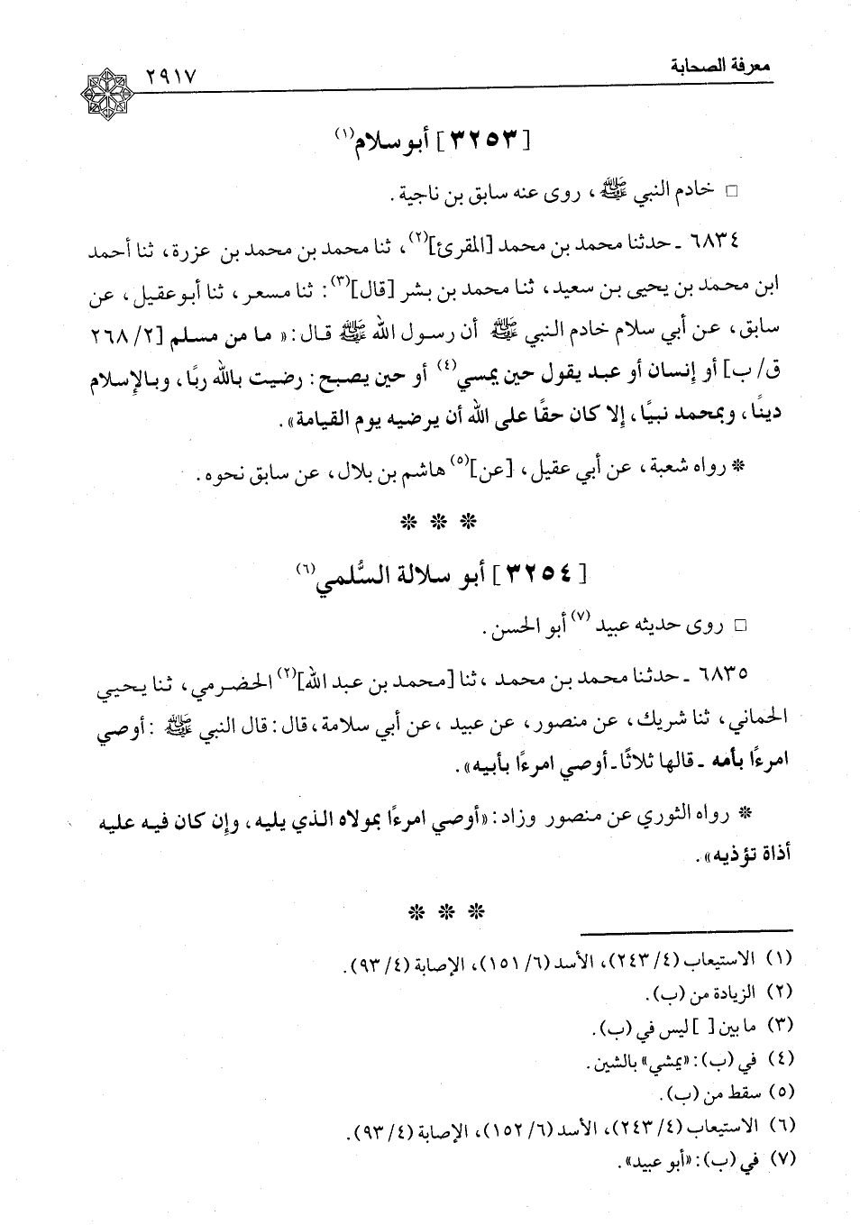 ٦٨٣٤ - حَدَّثَنَا مُحَمَّدُ بْنُ مُحَمَّدٍ الْمُقْرِئُ، ثنا مُحَمَّدُ بْنُ مُحَمَّدِ بْنِ عَزْرَةَ، ثنا أَحْمَدُ بْنُ مُحَمَّدِ بْنِ يَحْيَى بْنِ سَعِيدٍ، ثنا مُحَمَّدُ بْنُ بِشْرٍ، قَالَ: ثنا مِسْعَرٌ، ثنا أَبُو عَقِيلٍ، عَنْ سَابِقٍ، عَنْ أَبِي سَلَّامٍ، خَادِمِ النَّبِيِّ صَلَّى اللَّهُ عَلَيْهِ وَسَلَّمَ أَنَّ رَسُولَ اللهِ صَلَّى اللَّهُ عَلَيْهِ وَسَلَّمَ قَالَ: " مَا مِنْ مُسْلِمٍ أَوْ إِنْسَانٍ أَوْ عَبْدٍ يَقُولُ حِينَ يُمْسِي أَوْ حِينَ يُصْبِحُ: رَضِيتُ بِاللهِ رَبًّا، وَبِالْإِسْلَامِ دِينًا، وَبِمُحَمَّدٍ نَبِيًّا، إِلَّا كَانَ حَقًّا عَلَى اللهِ أَنْ يُرْضِيَهُ يَوْمَ الْقِيَامَةِ " رَوَاهُ شُعْبَةُ، عَنْ أَبِي عَقِيلٍ هَاشِمِ بْنِ بِلَالٍ، عَنْ سَابِقٍ نَحْوَهُ