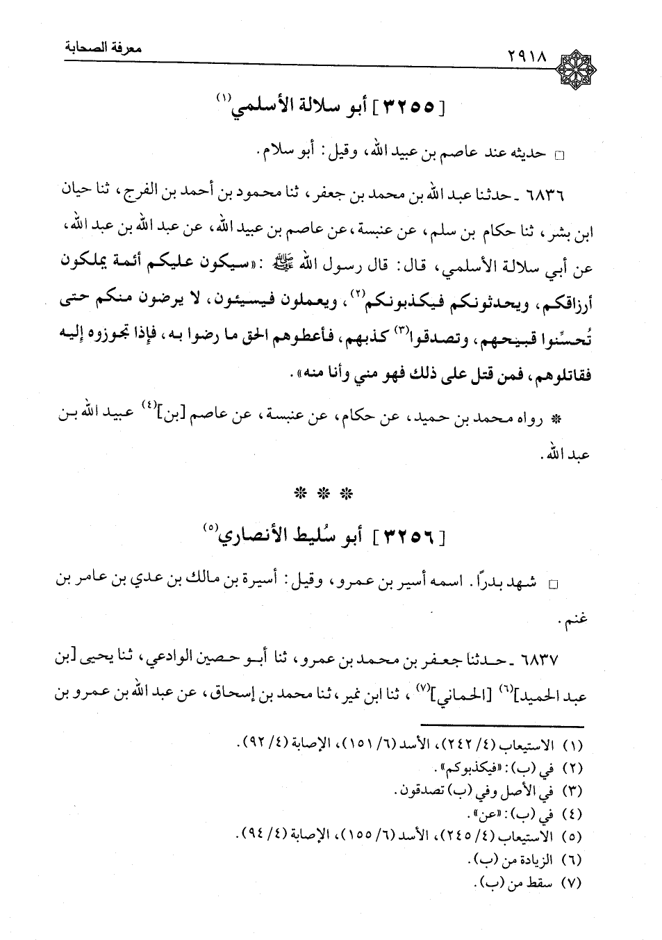 ٦٨٣٦ - حَدَّثَنَا عَبْدُ اللهِ بْنُ مُحَمَّدِ بْنِ جَعْفَرٍ، ثنا مَحْمُودُ بْنُ أَحْمَدَ بْنِ الْفَرَجِ، ثنا حَيَّانُ بْنُ بِشْرٍ، ثنا حَكَّامُ بْنُ سَلْمٍ، عَنْ عَنْبَسَةَ، عَنْ عَاصِمِ بْنِ عُبَيْدِ اللهِ، عَنْ عَبْدِ اللهِ بْنِ عَبْدِ اللهِ، عَنْ أَبِي سُلَالَةَ الْأَسْلَمِيِّ، قَالَ: قَالَ رَسُولُ اللهِ صَلَّى اللَّهُ عَلَيْهِ وَسَلَّمَ: «سَيَكُونُ عَلَيْكُمْ أَئِمَّةٌ يَمْلِكُونَ أَرْزَاقَكُمْ، وَيُحَدِّثُونَكُمْ فَيَكْذِبُونَكُمْ، وَيَعْمَلُونَ فَيُسِيئُونَ، لَا يَرْضَوْنَ مِنْكُمْ حَتَّى تُحَسِّنُوا قَبِيحَهُمْ، وَتُصَدِّقُوا كَذِبَهُمْ، فَأَعْطُوهُمُ الْحَقَّ مَا رَضُوا بِهِ، فَإِذَا تَجَوَّزُوهُ إِلَيْهِ، فَقَاتِلُوهُمْ، فَمَنْ قُتِلَ عَلَى ذَلِكَ فَهُوَ مِنِّي وَأَنَا مِنْهُ» رَوَاهُ مُحَمَّدُ بْنُ حُمَيْدٍ، عَنْ حَكَّامٍ، عَنْ عَنْبَسَةَ، عَنْ عَاصِمِ بْنِ عُبَيْدِ اللهِ، عَنْ عَبْدِ اللهِ